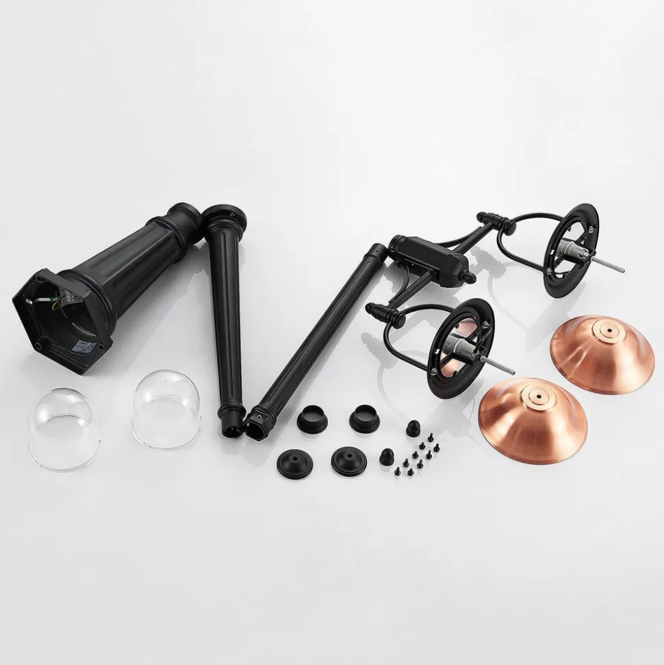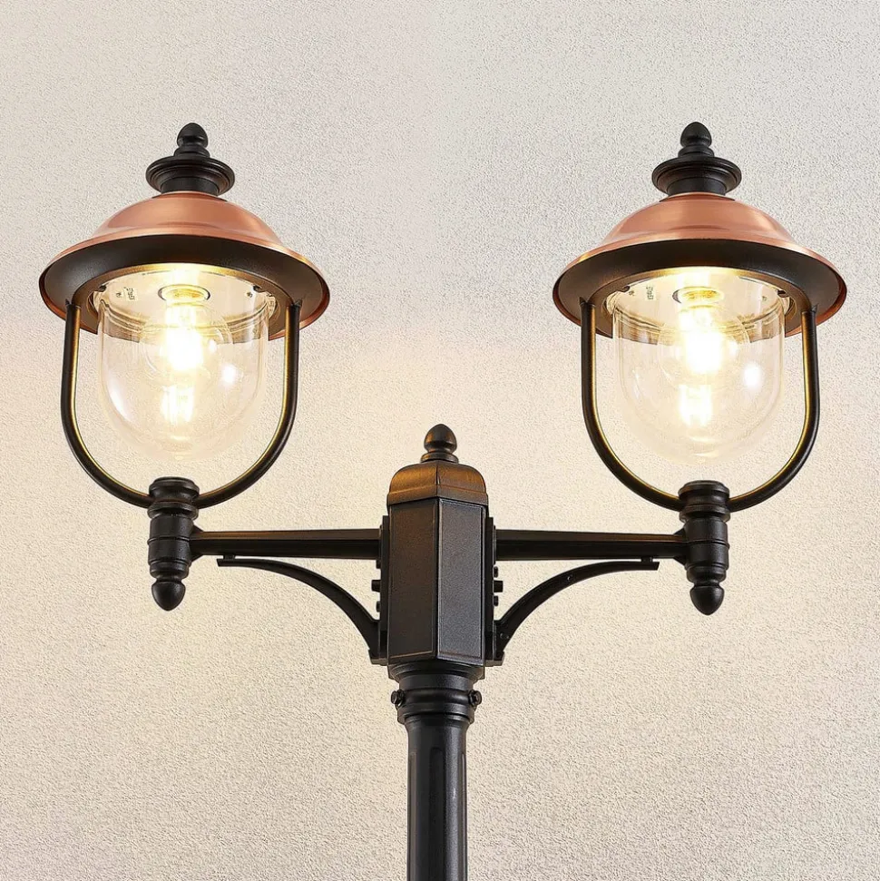 Clint – antieke lantaarnpaal met twee lichtbronnen De hoge Clint-kandelaar met zijn twee lichtbronnen biedt een uitstekende oriëntatieverlichting voor buiten. Op parkeerplaatsen, op opritten of in de tuin, Clint verlicht de omgeving veilig en betrouwbaar. De twee lichtbronnen zitten op het volledig zwarte aluminium frame en zien eruit als nostalgische lantaarns. Naast de kleine decoraties op het frame zelf, is er een visueel aantrekkelijk en functioneel detail op de kappen. De koperen bovenkant ziet eruit als een hoed of een dak en biedt tegelijkertijd een contrasterend speels element en een beschermende afdekking. Dankzij de materialen is Clint ook geschikt voor gebruik in de buurt van de zee.