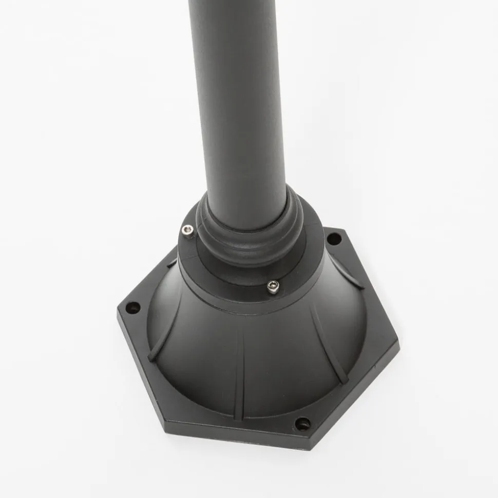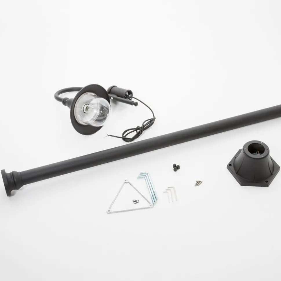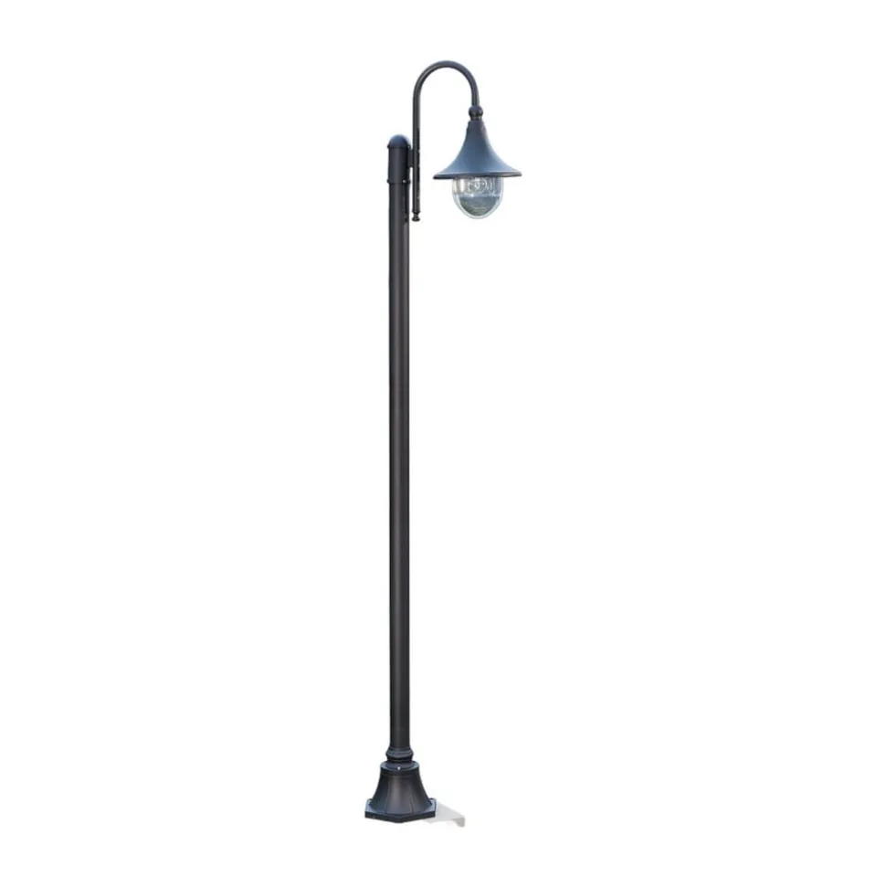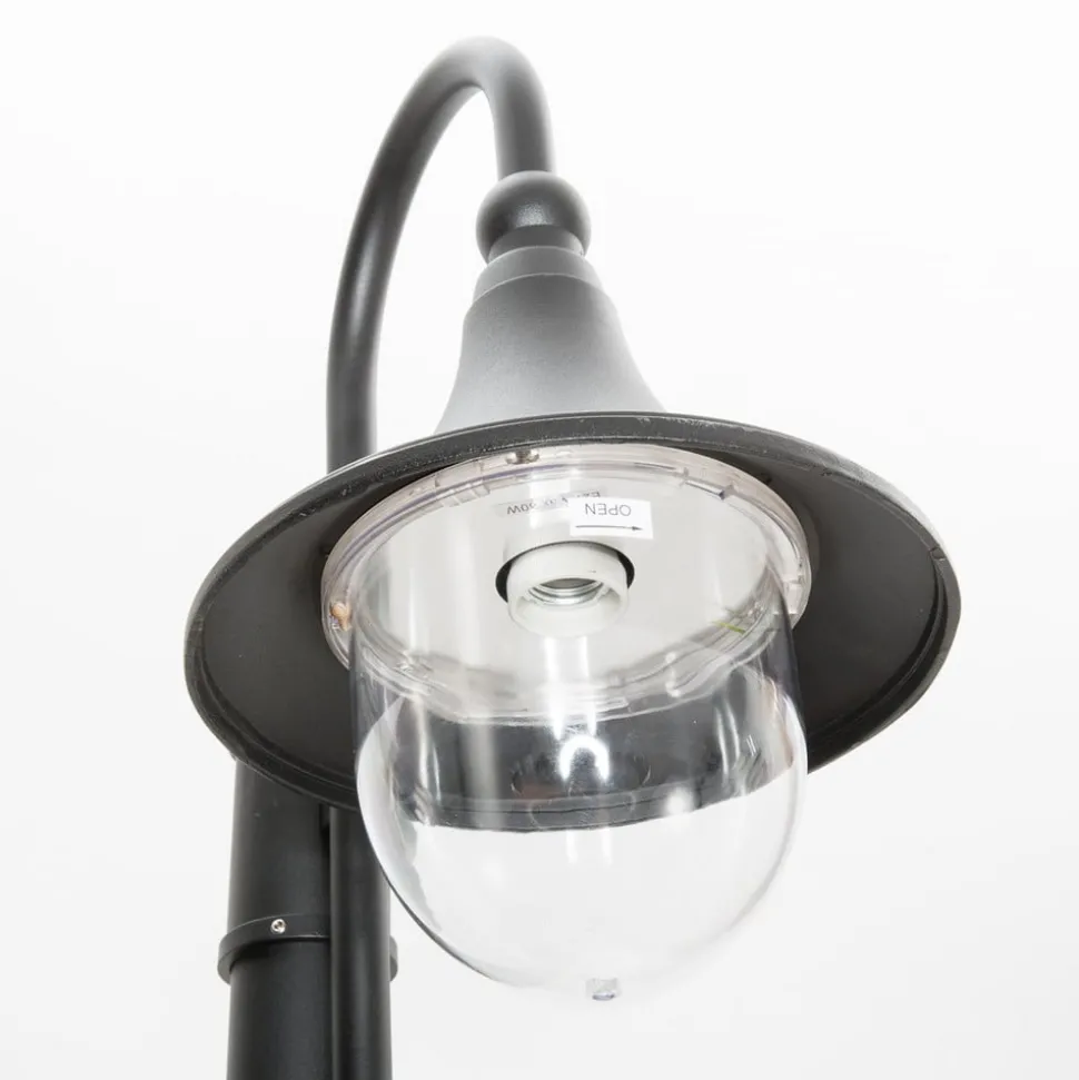 Daphne lantaarnpaal met gebogen lampenkop Een relatief tijdloos en tamelijk charmant ontwerp kenmerkt de Daphne lantaarnpaal, die tuinen en parken op een stijlvolle manier kan verlichten. De gebogen lampenkop steekt uit de paal, verbreedt zich dan tot een klokvormige kap en eindigt onderaan met een heldere polycarbonaat diffuser. Alle denkbare lampen met een E27 lampvoet en de juiste afmetingen kunnen als lamp worden gebruikt. Dit betekent dat buitenshuis altijd een geschikt lichtniveau kan worden bereikt, wat bescherming en veiligheid biedt tegen struikelgevaar dat in het donker niet zichtbaar zou zijn.