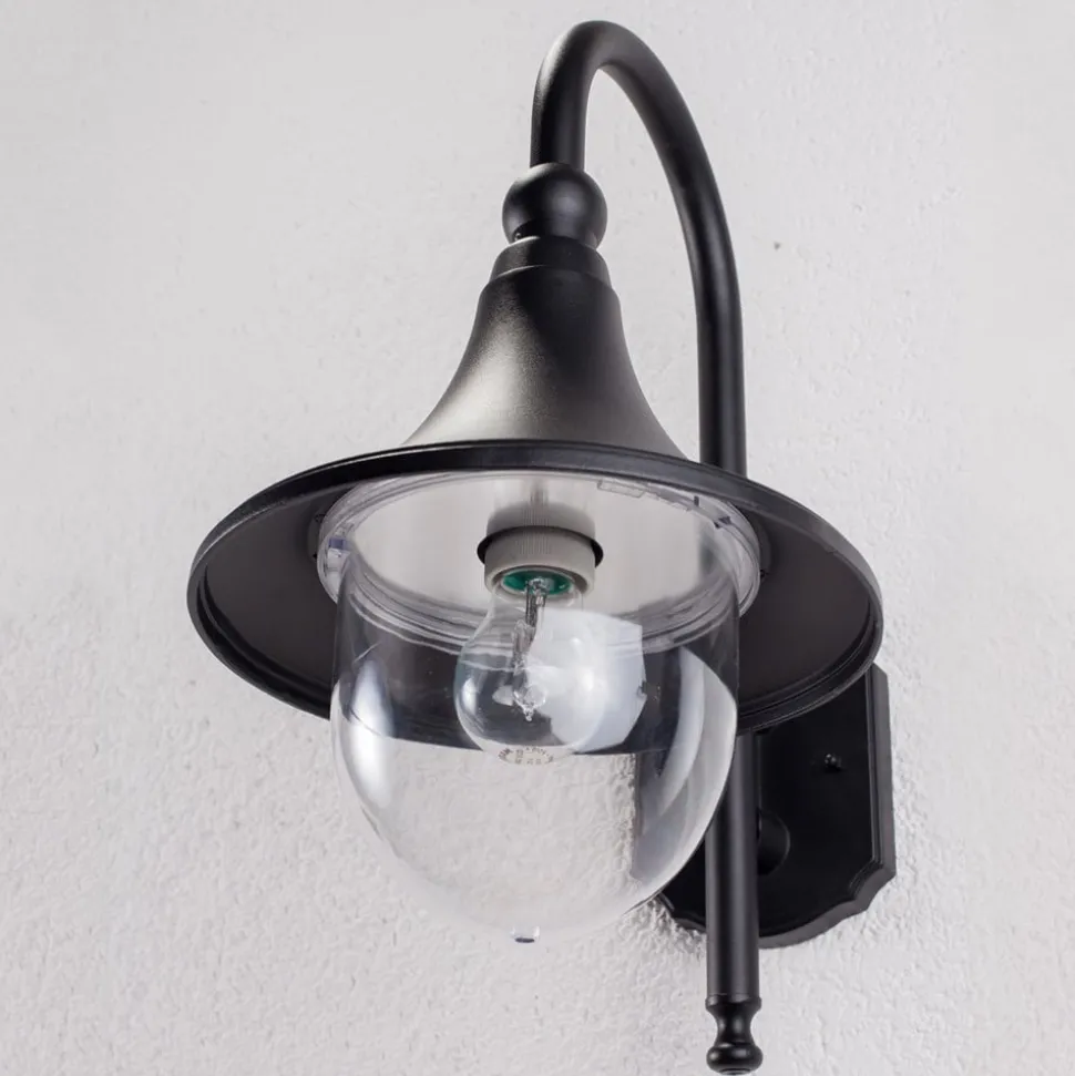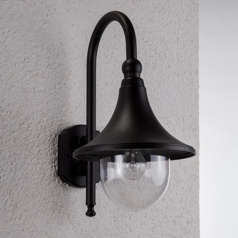 Prachtige Daphne buitenwandlamp met robuuste polycarbonaat diffuser De lampen uit de Daphne serie worden gekenmerkt door een tijdloos ontwerp in eenvoudig zwart. De lampenkop steekt uit het frame van de buitenwandlamp in de vorm van een boog en de kap loopt taps toe naar beneden in de vorm van een bel. De lamp wordt beschermd door een heldere polycarbonaat diffuser, die vooral de robuustheid van de lamp benadrukt – een eigenschap die natuurlijk niet onderschat mag worden in buitenruimtes, omdat er altijd verschillende invloeden kunnen zijn, vooral het weer, die de kap en de lamp moeten weerstaan. Uitgerust met een E27 fitting is er een grote keuze aan lichtbronnen die gebruikt kunnen worden: klassieke gloei- en halogeenlampen kunnen gebruikt worden, maar ook energiezuinigere LED lampen en spaarlampen.