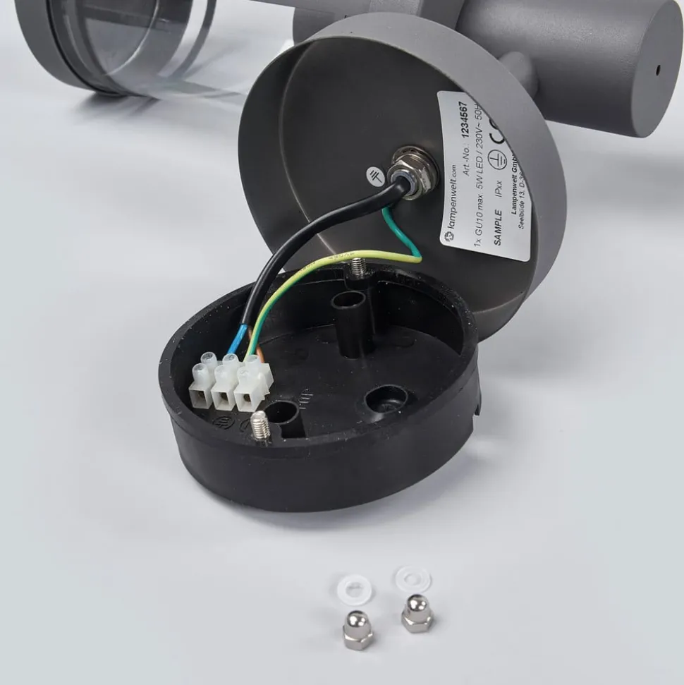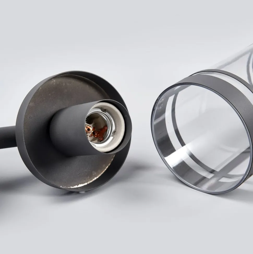 Donkergrijze Djori buitenwandlamp met heldere diffuser De armatuur Djori is gemaakt van roestvrij staal en vervolgens afgewerkt met een donkergrijze verf. De basisvorm van de kap is cilindrisch en het inzetstuk is gemaakt van helder polycarbonaat, zodat het licht en de lamp volledig onbelemmerd zijn. De buitenwandlamp kan worden gebruikt als aanvulling op een moderne omgeving en biedt een stijlvolle lichtbron.