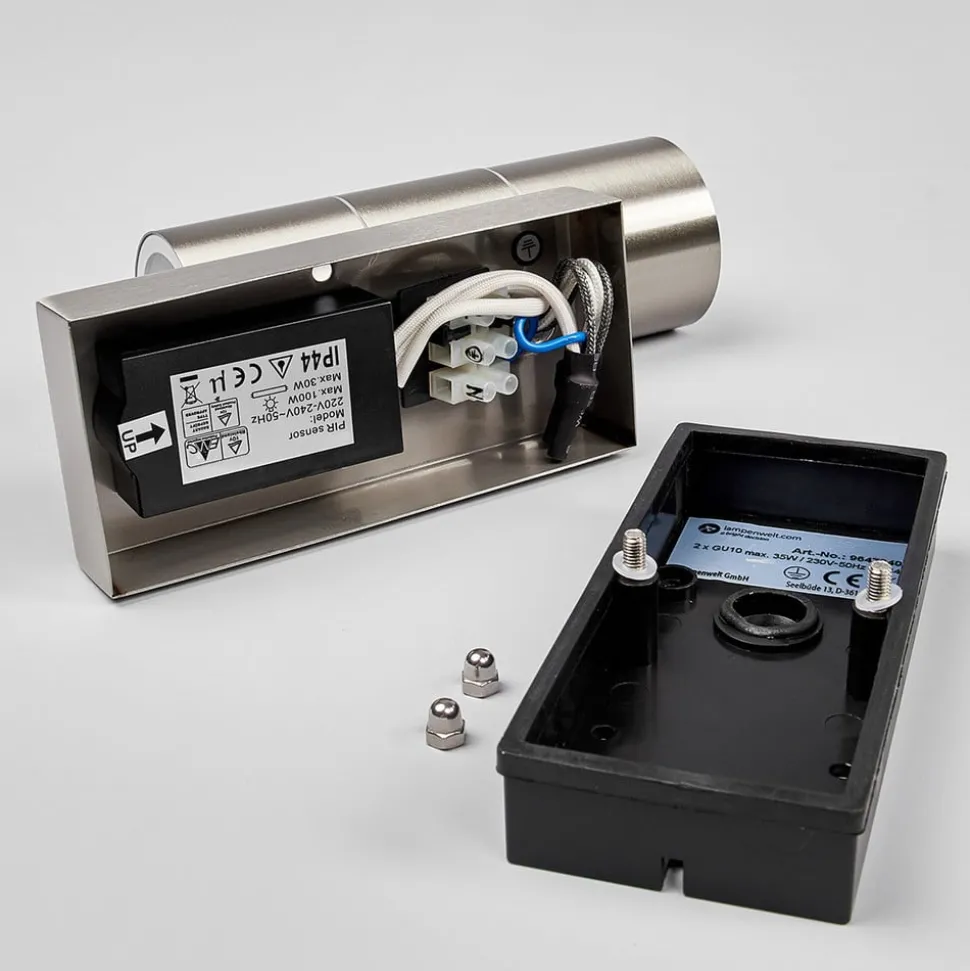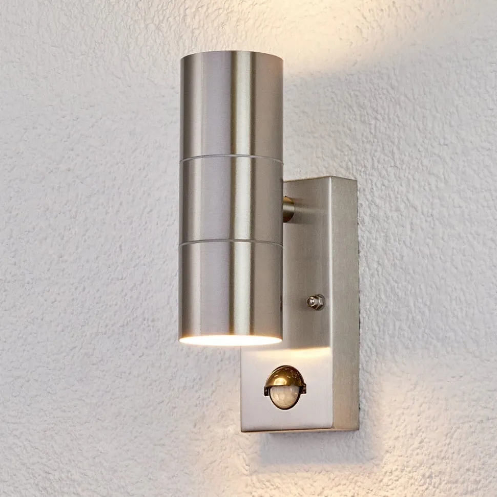 Lindby buitenwandlamp Eyrin, hoogte 22 cm, roestvrij staal, sensor
