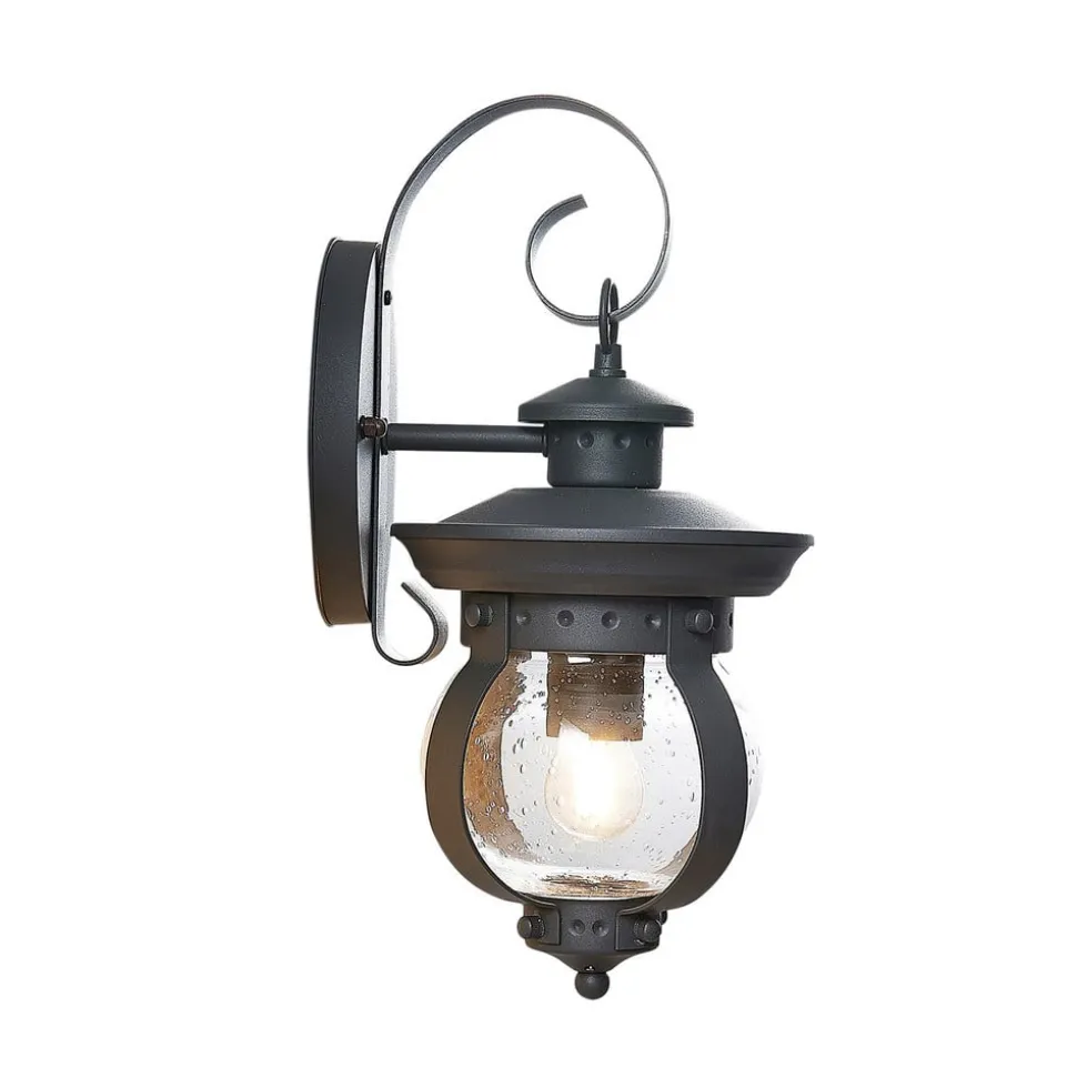 Farley buitenwandlamp in een decoratieve lantaarnvorm Het ontwerp van de Farley buitenwandlamp doet een beetje denken aan vervlogen tijden. Het ontwerp van de kap ziet eruit als een bolvormige lantaarn die naar beneden hangt en met een plaat stevig aan de muur is bevestigd. De te gebruiken lamp wordt omlijst door een glazen kap die decoratief is versierd met kleine luchtbelletjes. Deze creëren ook een magisch lichteffect wanneer het licht wordt ingeschakeld. Door het transparante glas komen decoratieve filament lampen, die verkrijgbaar zijn als accessoire, goed tot hun recht. Farley is een moderne buitenwandlamp die er geweldig uitziet bij de ingang van een huis of bijvoorbeeld op terrassen, veranda’s of balkons. Met haar ijzeren frame en aluminium muurplaat is de Farley buitenwandlamp ook robuust.
