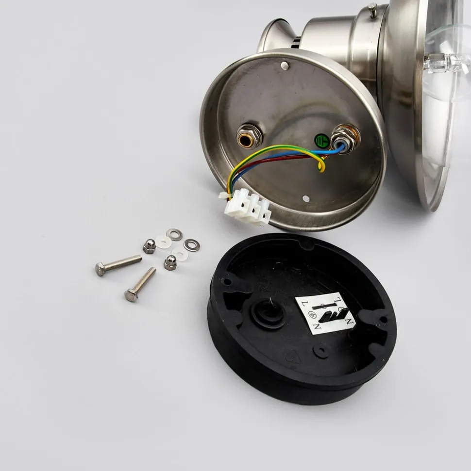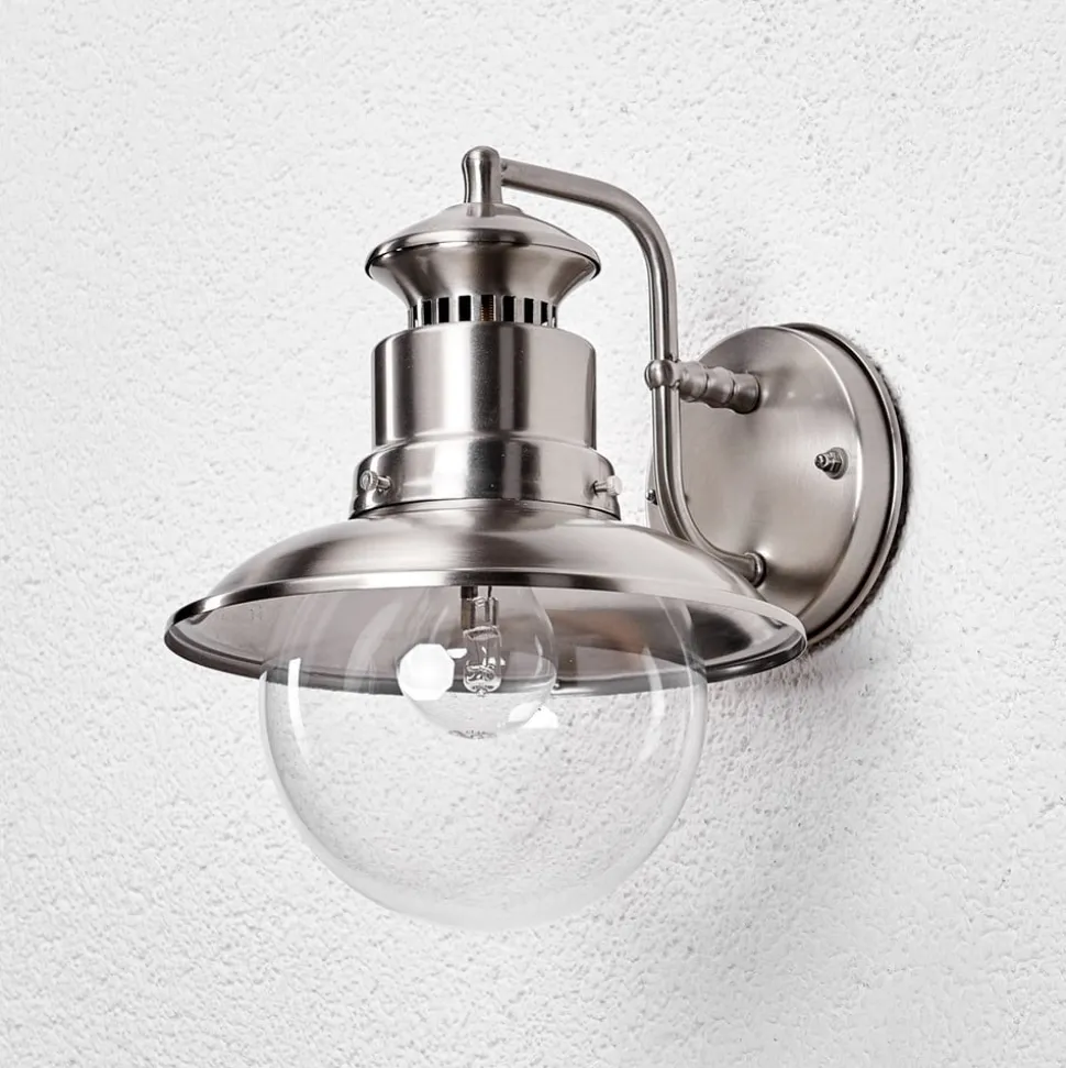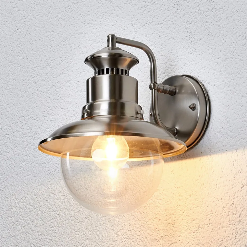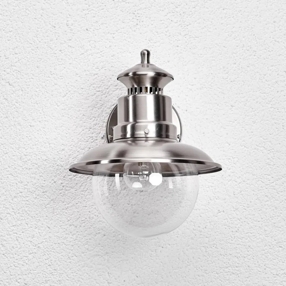 Gwendolyn buitenwandlamp met roestvrijstalen frame Modern of antiek? Het uiterlijk van de buitenwandlamp Gwendolyn combineert beide: het roestvrijstalen oppervlak geeft haar een fundamenteel moderne touch, maar de ronde vorm heeft ook een nostalgische uitstraling en doet denken aan de klassieke lantaarns van weleer. Het feit dat de wandlamp voorzien is van een E27 fitting betekent dat alle soorten lichtbronnen gebruikt kunnen worden, want zowel gloei- en halogeenlampen als de meer energiebesparende spaar- en LED lampen zijn standaard verkrijgbaar.