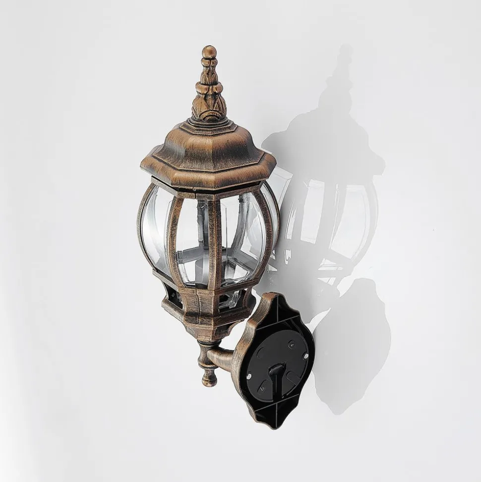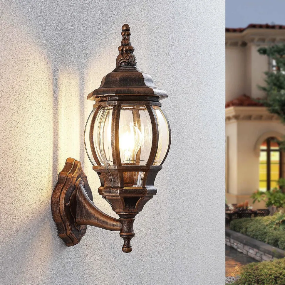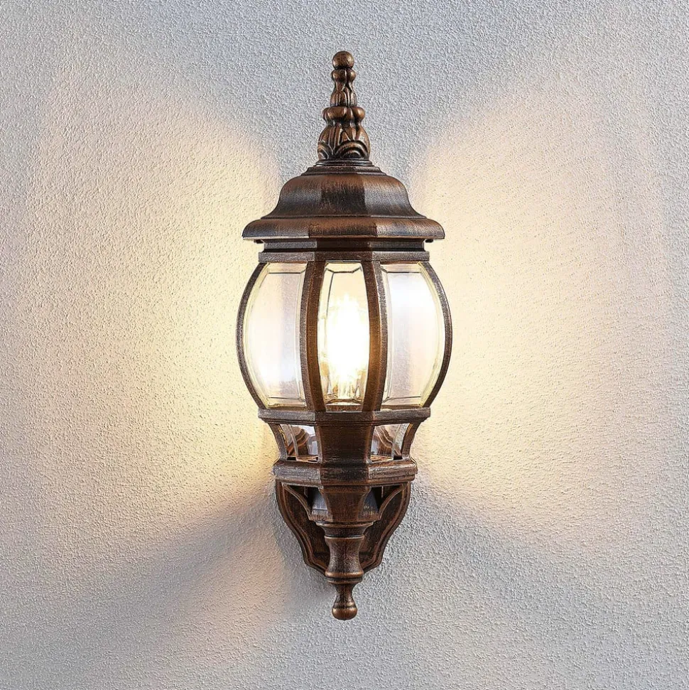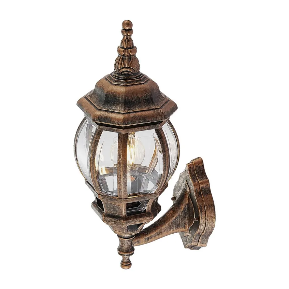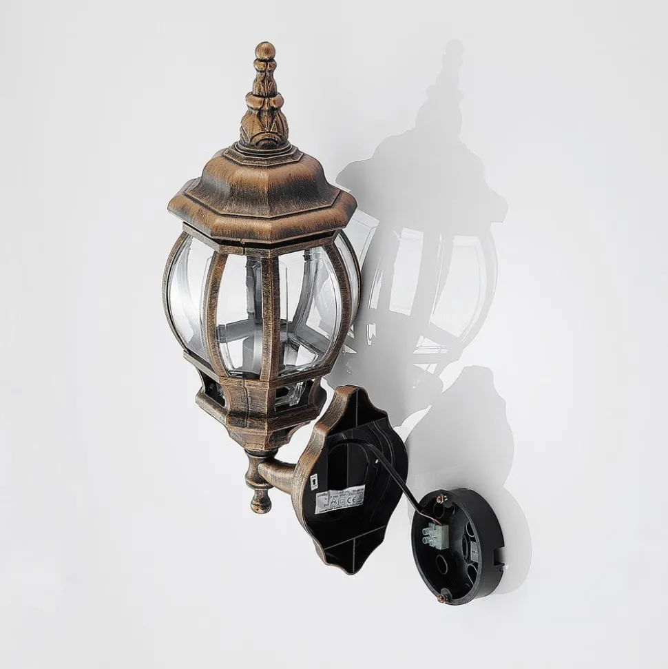 Goudkleurige buitenwandlamp Nadesha met antieke look en oriëntaalse flair Nadesha is een zeer mooie lichtbron voor buiten, die indruk maakt met haar glinsterende gouden oppervlak dat een prachtige antieke look heeft. De speciale vorm zorgt ook voor een oosterse look met een aantrekkelijk effect. De behuizing is gemaakt van kunststof, net als de heldere inzetstukken. Dit maakt van Nadesha een wandlamp voor buiten die punten scoort voor haar weerstand tegen zeewater. De stijlvolle LED filament of rustiek lampen zijn bijzonder aan te bevelen als lamp – IK06 slagvastheidsklasse