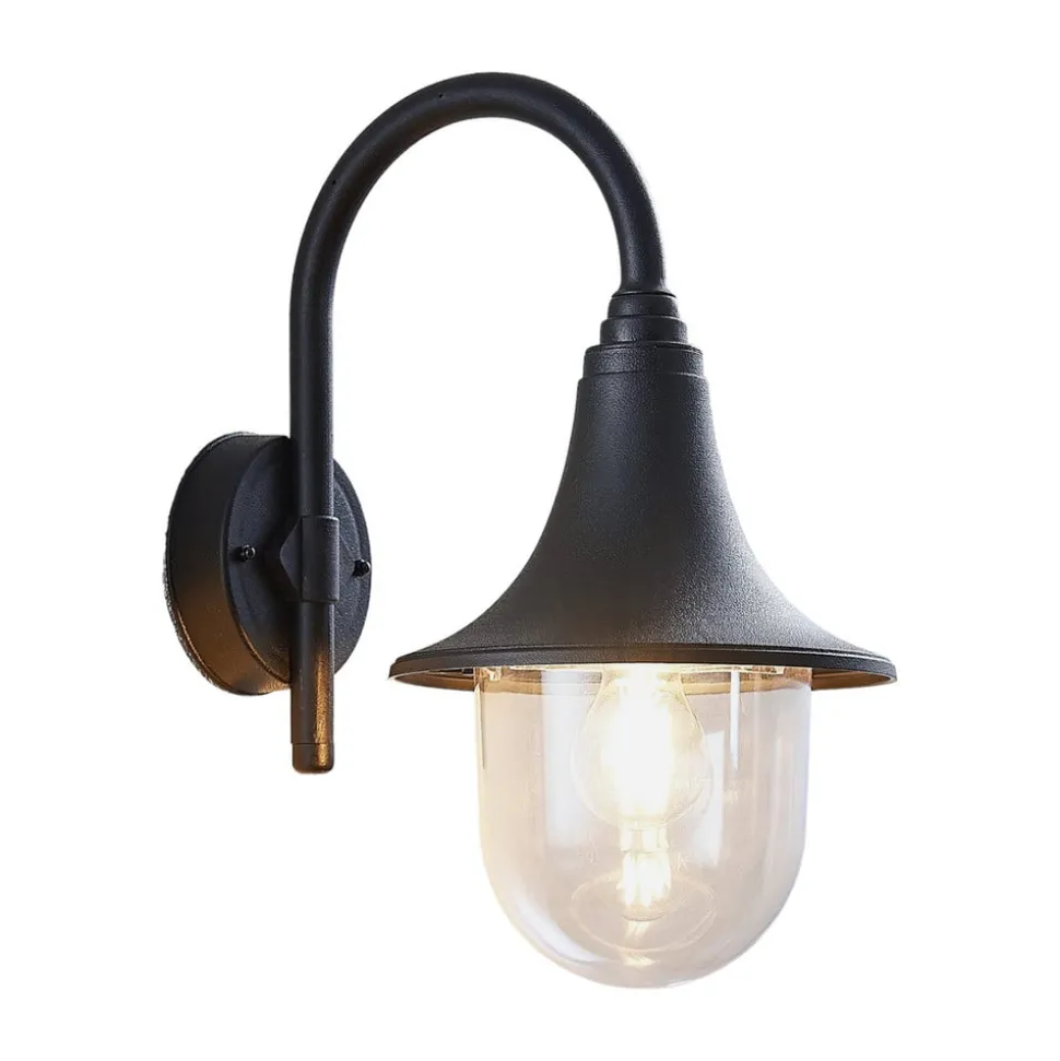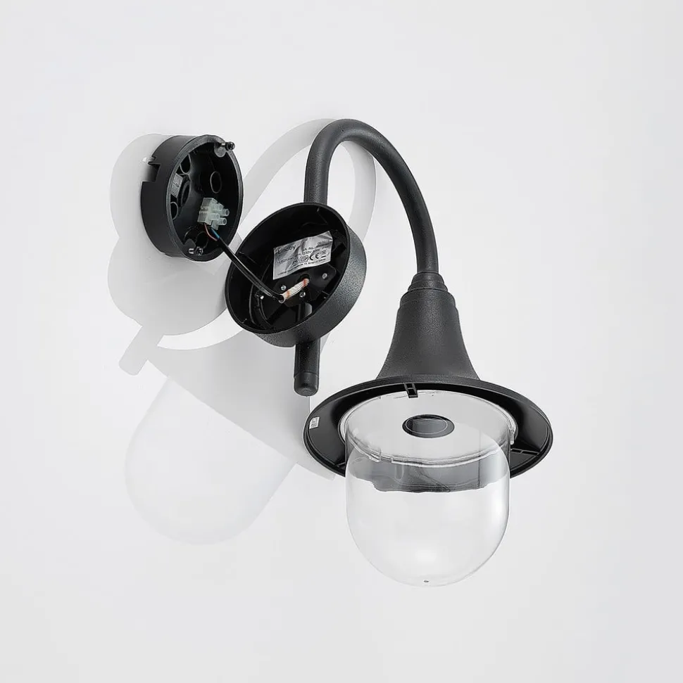 Gebogen buitenwandlamp Nalevi in zwart, zeewaterbestendig, IK06 De gebogen lampenarm van Nalevi leidt naar een lampenkap die naar beneden toe breder wordt en onderaan eindigt in een heldere polycarbonaatkoepel. Alle onderdelen zijn gemaakt van kunststof en worden gekenmerkt door zeewaterbestendigheid, waardoor ze bijzonder robuust zijn en geschikt voor installatie in gebieden waar de omgeving wordt gedomineerd door zoute lucht. De lamp is van buitenaf duidelijk zichtbaar door de heldere koepel en past daarom goed in het algehele ontwerp. Dit geldt voor alle lichtbronnen met een gloeilamp-look, inclusief LED lampen met een gloeilamp-look. Het algehele ontwerp van de buitenwandlamp heeft een klassieke uitstraling en mist geen antiek karakter, waardoor Nalevi historische gebouwen bijzonder goed aanvult.