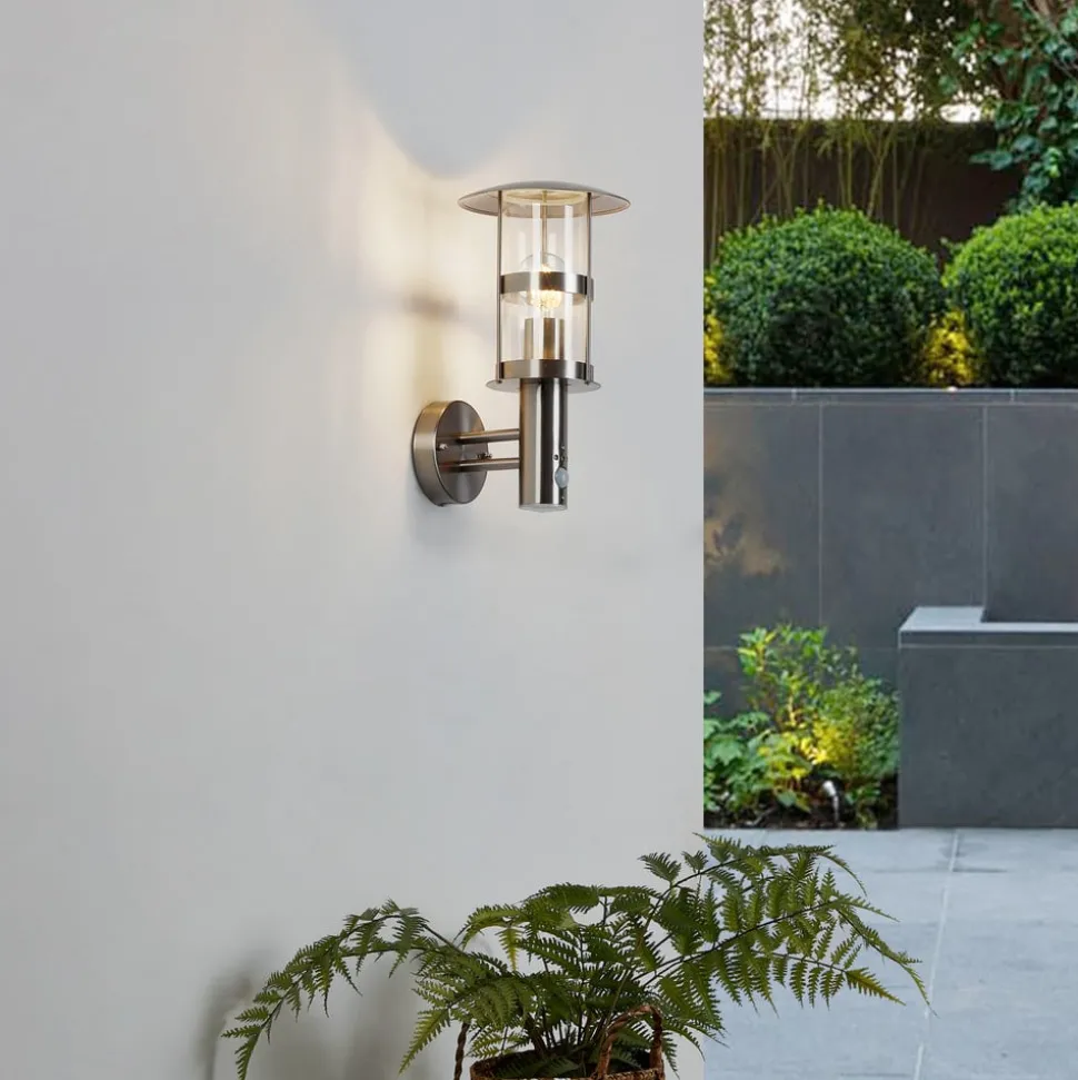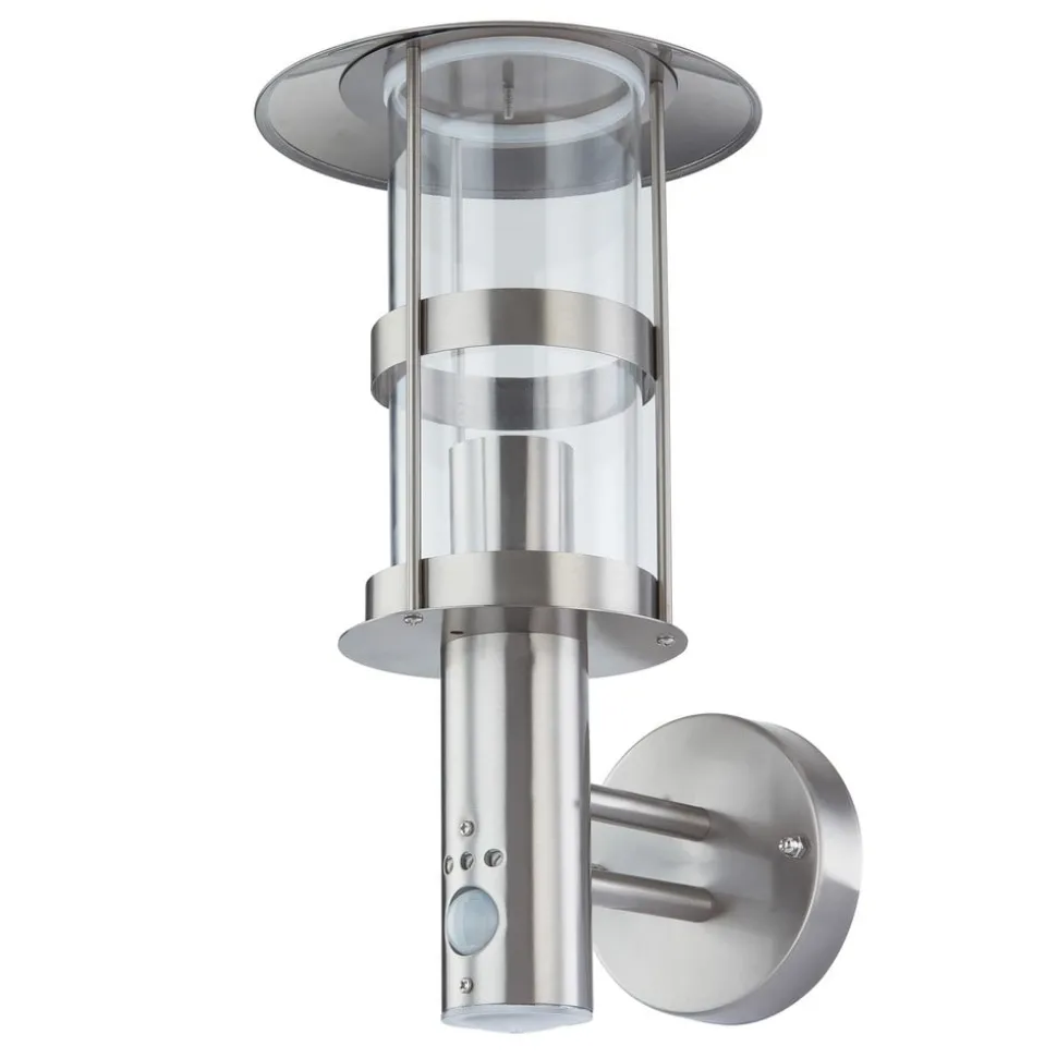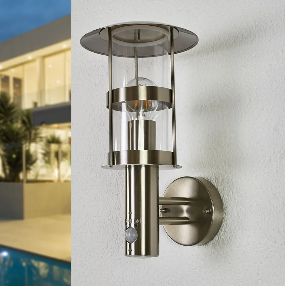 Buitenwandlamp Noemi met koepelvormig dak en geïntegreerde bewegingsmelder Noemi is grotendeels gemaakt van roestvrij staal, alleen het inzetstuk boven de lamp is van doorzichtig kunststof. Omdat er een bewegingsmelder is geïntegreerd in het onderste deel van het frame, reageert de buitenwandlamp op de bewegingen van mensen die de lamp naderen. De detectiehoek van de sensor is 90° en het bereik is 6-8 meter. De lichtduur is variabel instelbaar, met een waarde tussen 10 seconden en 4 minuten.