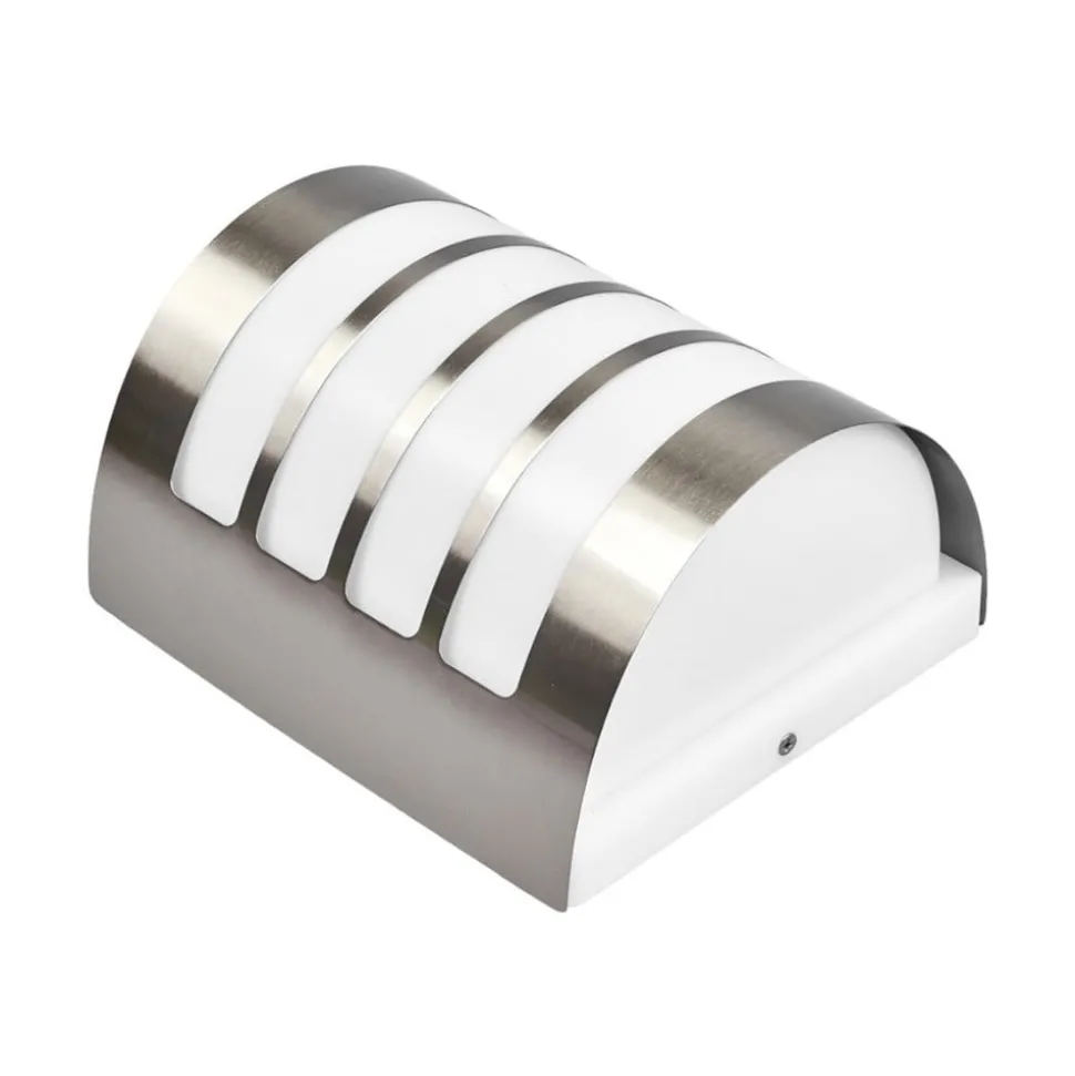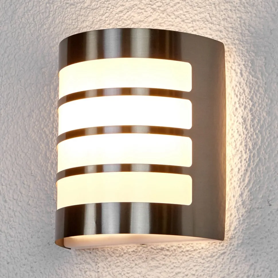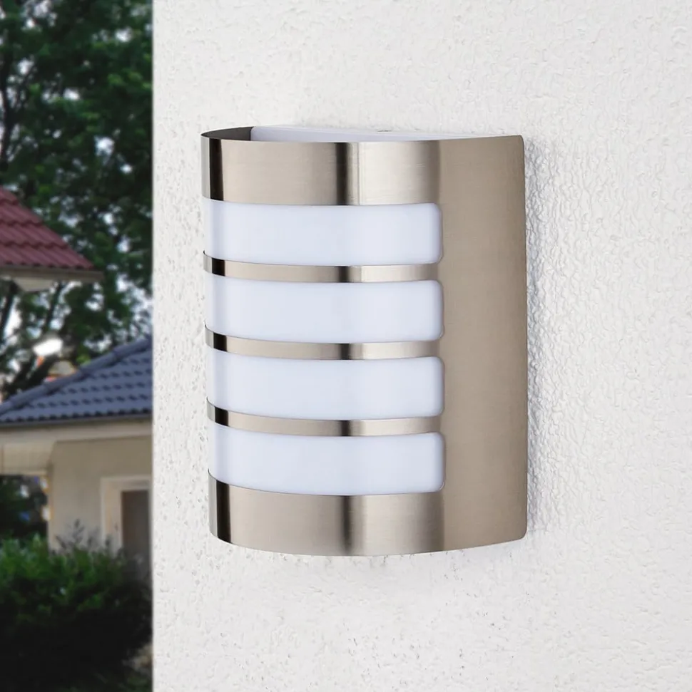 Noyan roestvrijstalen buitenwandlamp met een prachtig streepdesign De armatuur van Noyan heeft een zachte gebogen vorm en is grotendeels gemaakt van roestvrij staal, waardoor hij roestvrij is bij gebruik buitenshuis. De strepen verbeteren het uiterlijk van de buitenwandlamp van roestvrij staal op aangename wijze en geven haar een meer individueel karakter. De E27 fitting maakt het gebruik van verschillende lichtbronnen mogelijk, zodat ook retrofit LED lampen zonder problemen gebruikt kunnen worden.