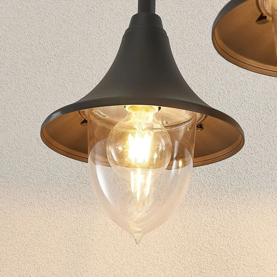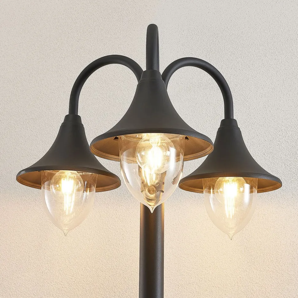 3-lamps lantaarnpaal Edric met nostalgische flair De lantaarnpaal Edric met zijn nostalgische, antieke ontwerp is zeer aantrekkelijk om naar te kijken en zorgt niet alleen ’s avonds voor betrouwbare verlichting, maar is ook overdag een echte blikvanger. Gebruikt op parkeerplaatsen, opritten of in de tuin, verlicht Edric zijn omgeving betrouwbaar met zijn drie lichtbronnen. Edric kan zelfs in de buurt van de zee worden geïnstalleerd en gebruikt, omdat de lantaarnpaal zeewaterbestendig is. Het frame is gemaakt van aluminium en de drie lichtbronnen worden extra beschermd door een transparante kap van doorzichtige kunststof.