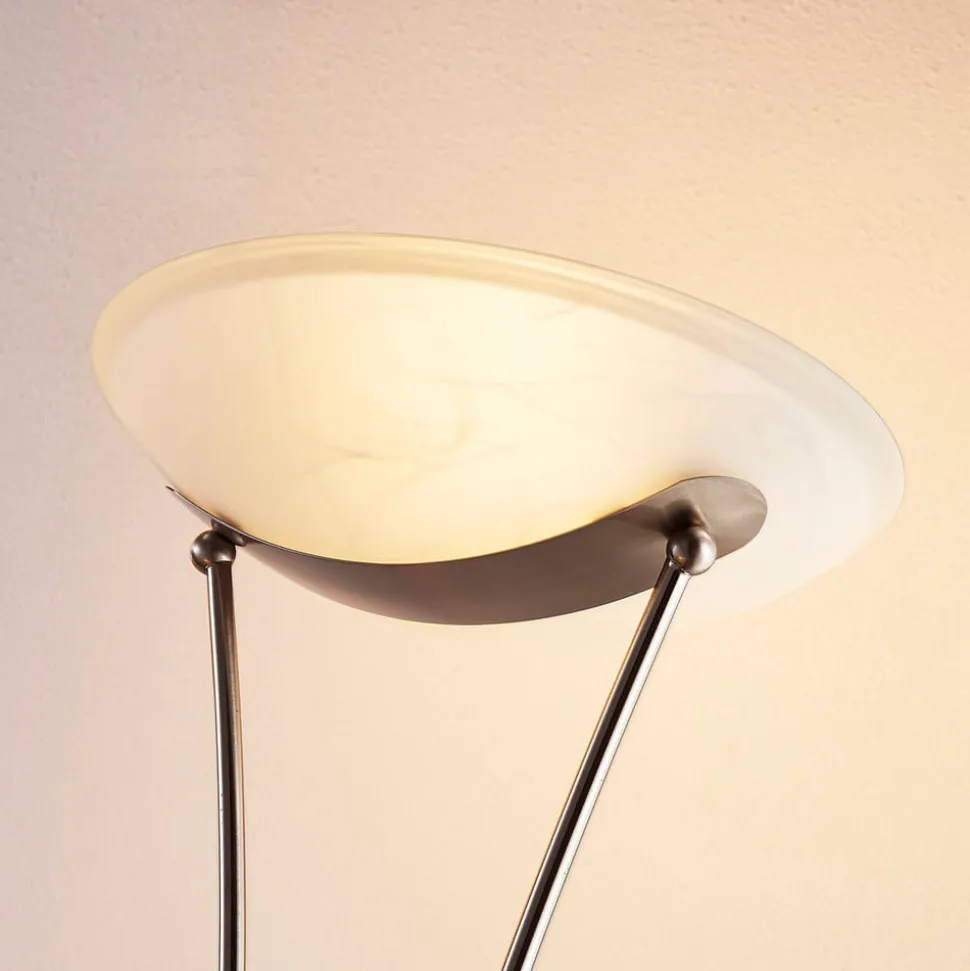 Felicia uplighter met praktische leeslamp Felicia is een prachtige uplighter die werkt met energiebesparende LED’s en gemakkelijk gecombineerd kan worden met verschillende stijlen. Het oppervlak van het metalen frame is nikkelkleurig en gesatineerd, terwijl de twee glazen kappen wit zijn met een aantrekkelijke albastint. Elke lichtbron vervult hier zijn eigen doel. De uplighter is bedoeld voor gezellige algemene verlichting en kan ’s avonds worden ingeschakeld in plaats van de hoofdverlichting, terwijl de leeslamp selectief maar gericht licht geeft ter ondersteuning van lezen of kleine handmatige werkzaamheden. Beide lichtcomponenten zijn uitgerust met een aparte schakelaar voor extra gemak.
