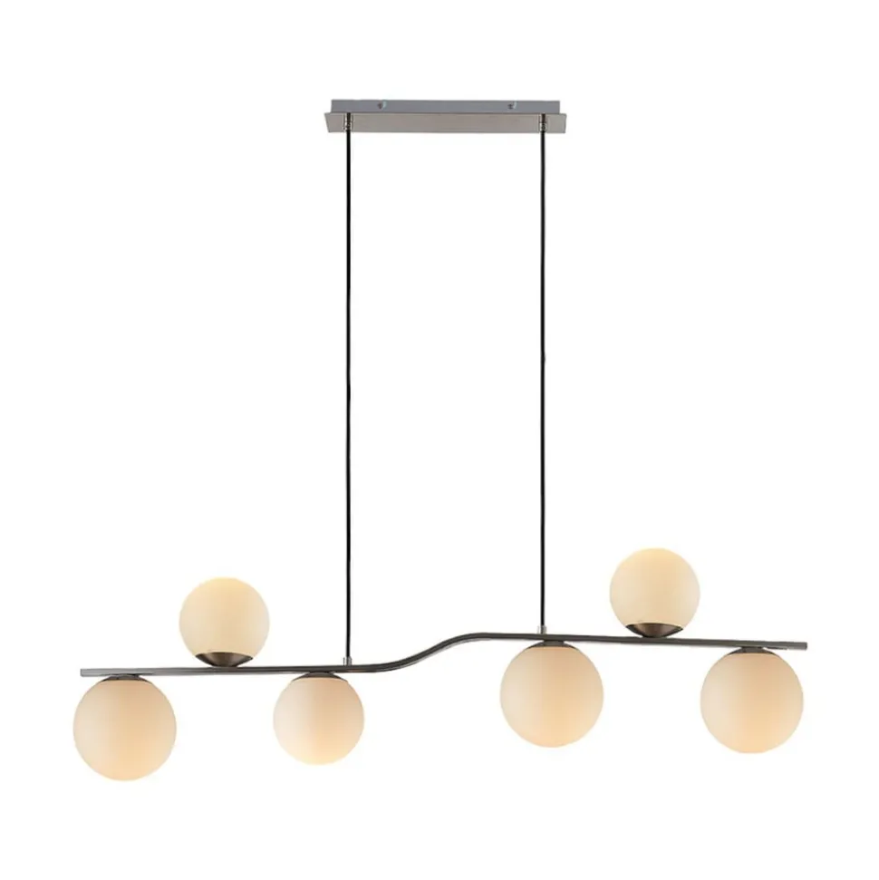 6-lamps hanglamp Avalyn voor de eetkamer met witte glazen bollen in twee verschillende maten Avalyn is een zeer aantrekkelijke lichtbron voor de eethoek die dankzij de zes glazen bollen een goede sfeerverlichting voor de eettafel biedt. Het opaalwitte oppervlak is ook de beste garantie voor zacht, gezellig licht, omdat er geen verblinding is. Het frame is licht geribbeld en de zes bolvormige glazen kappen zijn in twee verschillende maten aan het frame bevestigd. Ideaal voor moderne interieurs!