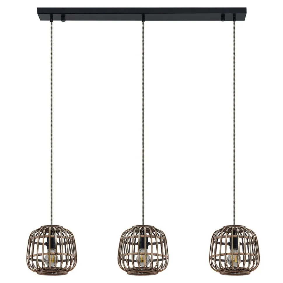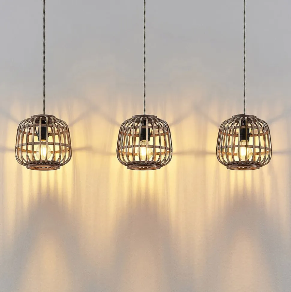 Aantrekkelijke hanglamp Bominio met drie rotan kappen De hanglamp Bominio maakt indruk met zijn open concept en moderne ontwerp. De drie kappen zijn gemaakt van rotan en hebben een vrij open karakter, zodat de te gebruiken lampen van buitenaf goed zichtbaar zijn. Ze moeten daarom worden gekozen in overeenstemming met de decoratieve stijl. Met hun vele stokjes creëren de korfachtige kappen een bijzonder spel van licht en schaduw in de kamer – ideaal om een gezellige sfeer te creëren boven een eetkamertafel.