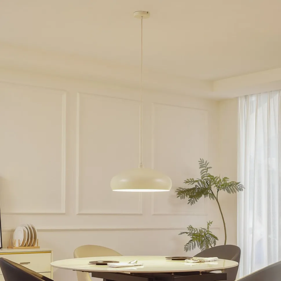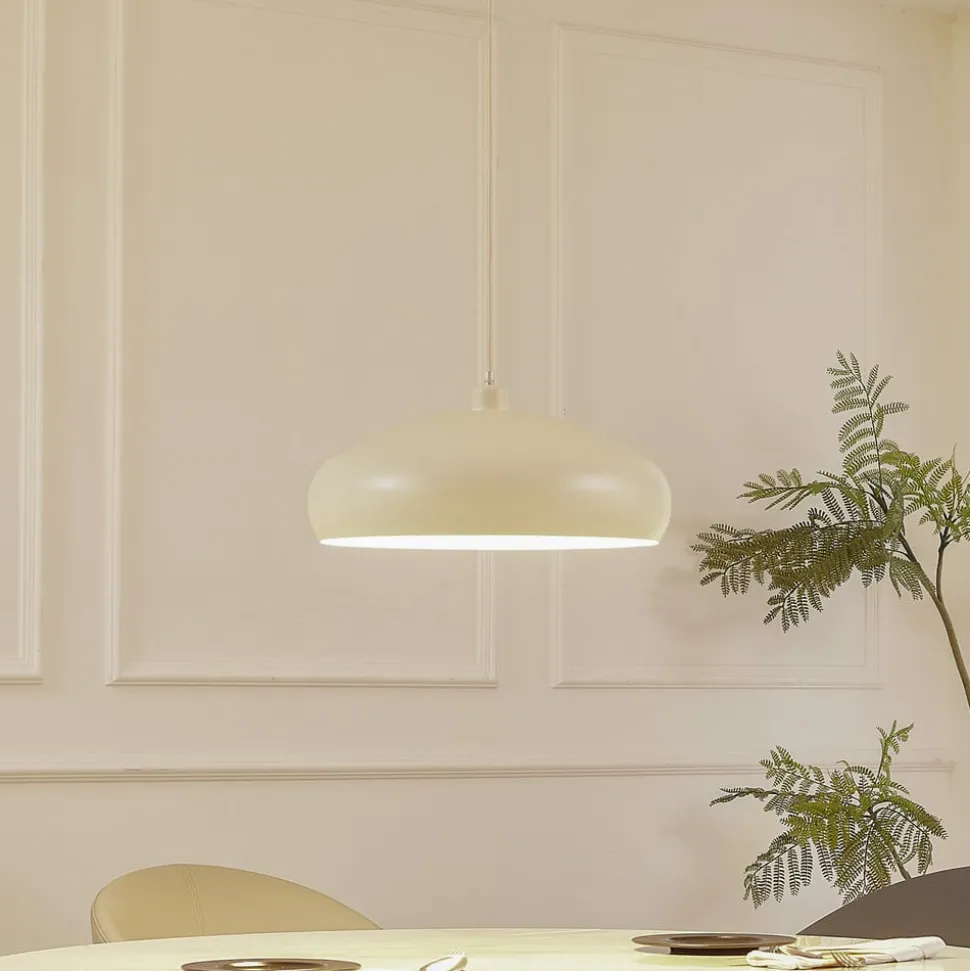 Ronde hanglamp Elover van ijzer De 1-lamp hanglamp Elover is gemaakt van ijzer. De ronde kap is rondom ondoorzichtig en is alleen aan de onderkant open. Hierdoor kan het gegenereerde licht direct naar beneden stromen en bijvoorbeeld tafeloppervlakken uitgebreid verlichten. De binnenkant van de kap reflecteert het licht zachtjes in de omgeving en benadrukt de prachtige beige kleur van Elover.