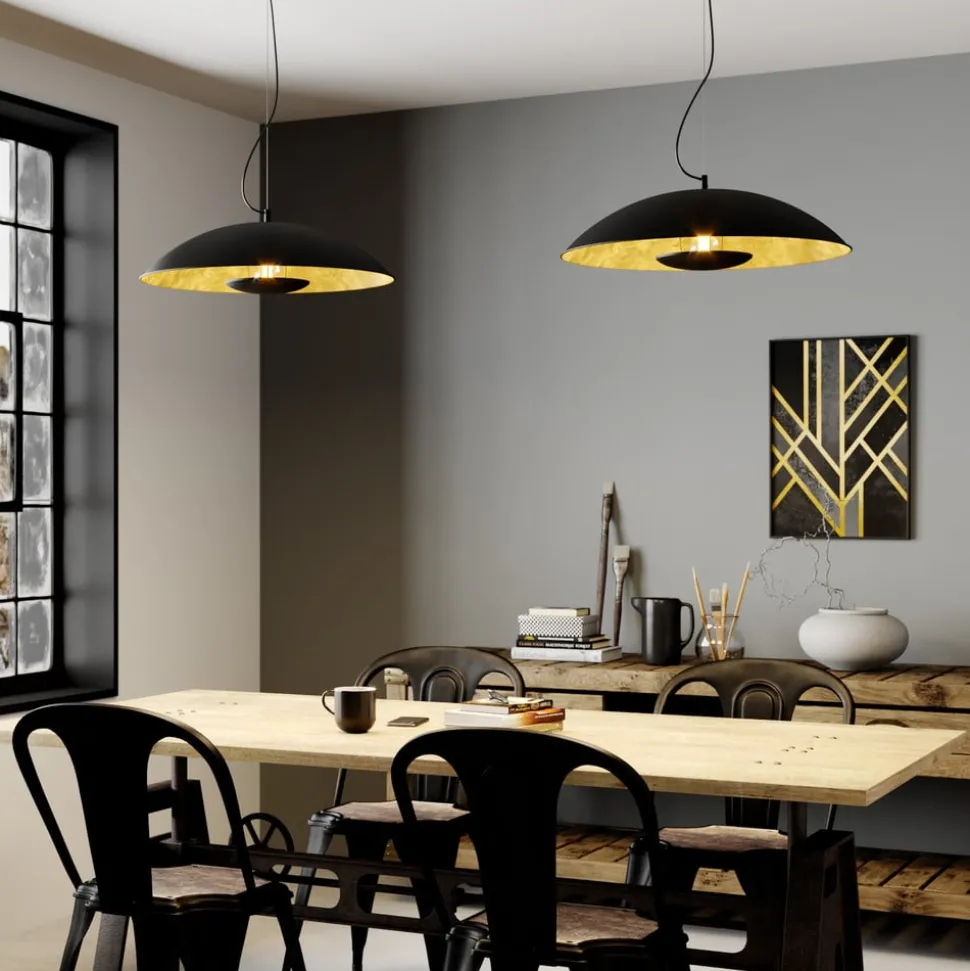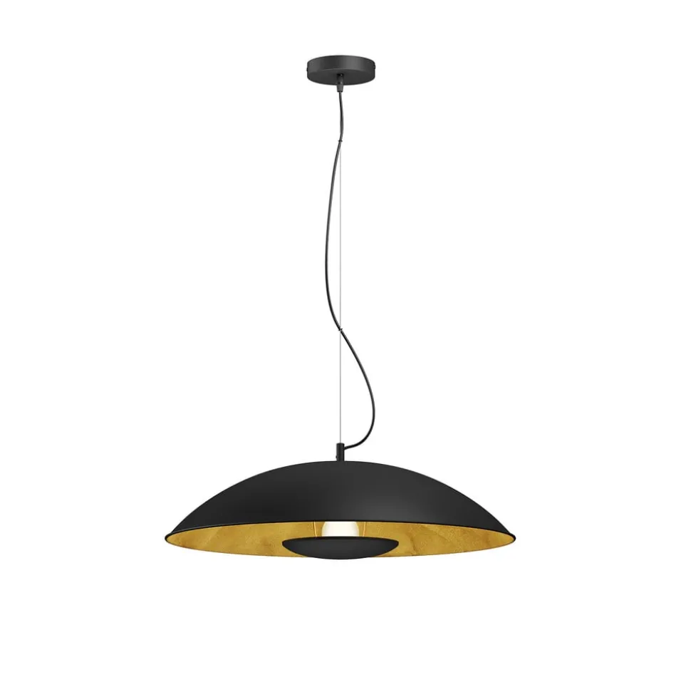 Zwart-gouden hanglamp Emilienne met ronde metalen kap en indirecte lichtuitstraling voor een bijzonder gezellige sfeer De ronde vorm van de metalen kap ziet er zeer elegant uit, wat nog wordt versterkt door het feit dat de kap aan de binnenkant is afgewerkt met mat goud, zodat de hanglamp een diep warm licht uitstraalt. Het knusse effect van de hanglamp wordt versterkt door het feit dat Emilienne een kap heeft direct boven de lamp, die alleen indirecte lichtuitstraling toelaat en daardoor een zacht, vloeiend licht creëert zonder enige verblinding. Als bijvoorbeeld een eettafel echt gezellig verlicht moet worden, dan is deze hanglamp zeker een verlichtingselement dat op de shortlist moet staan.