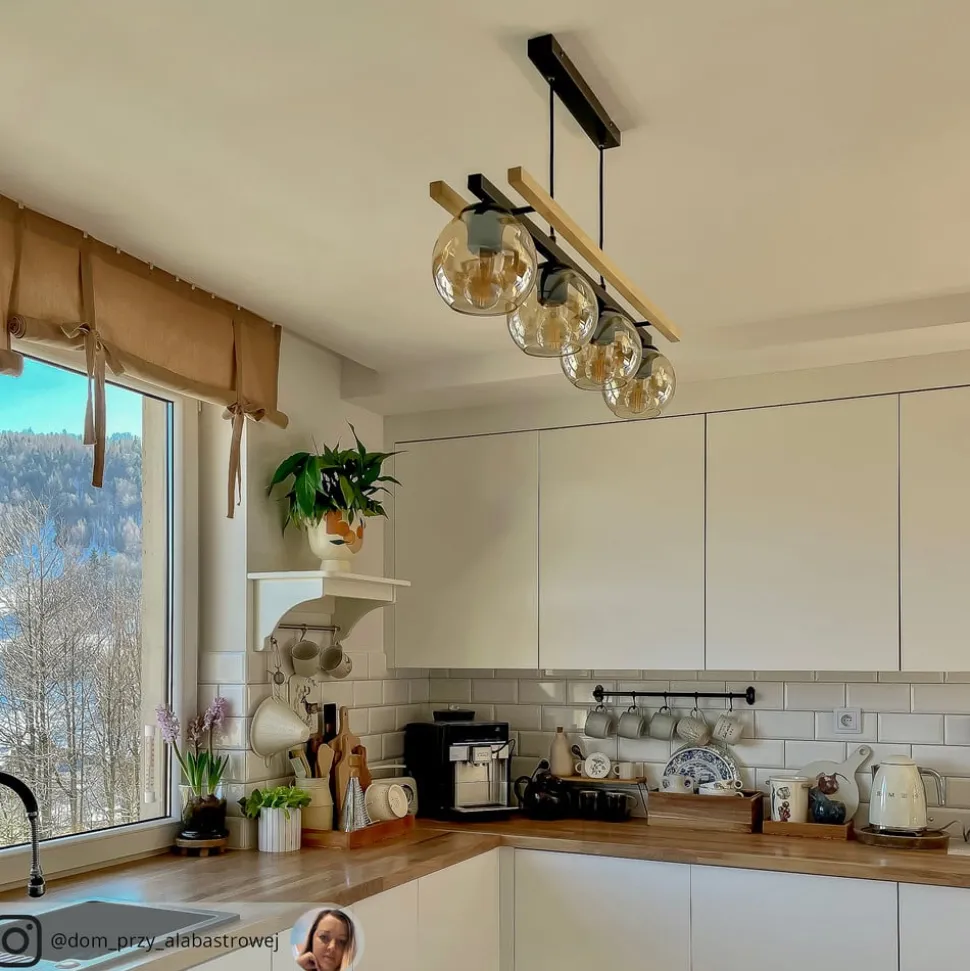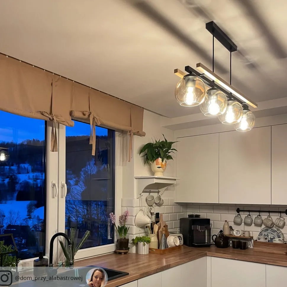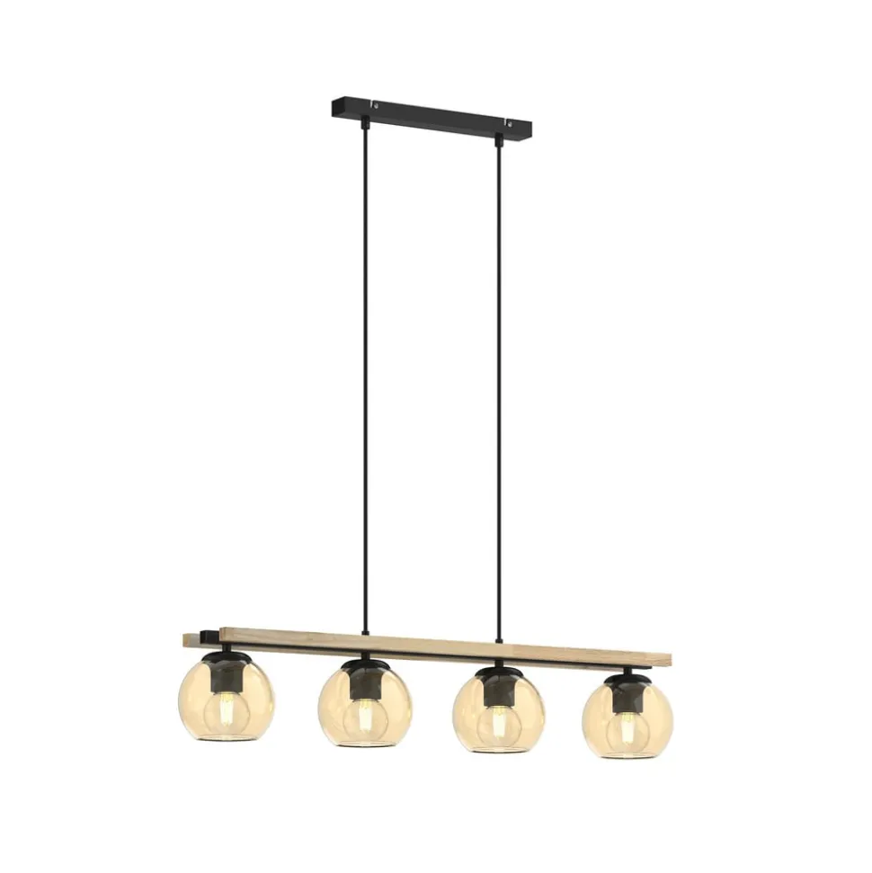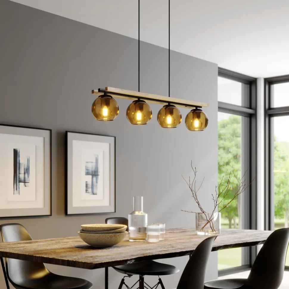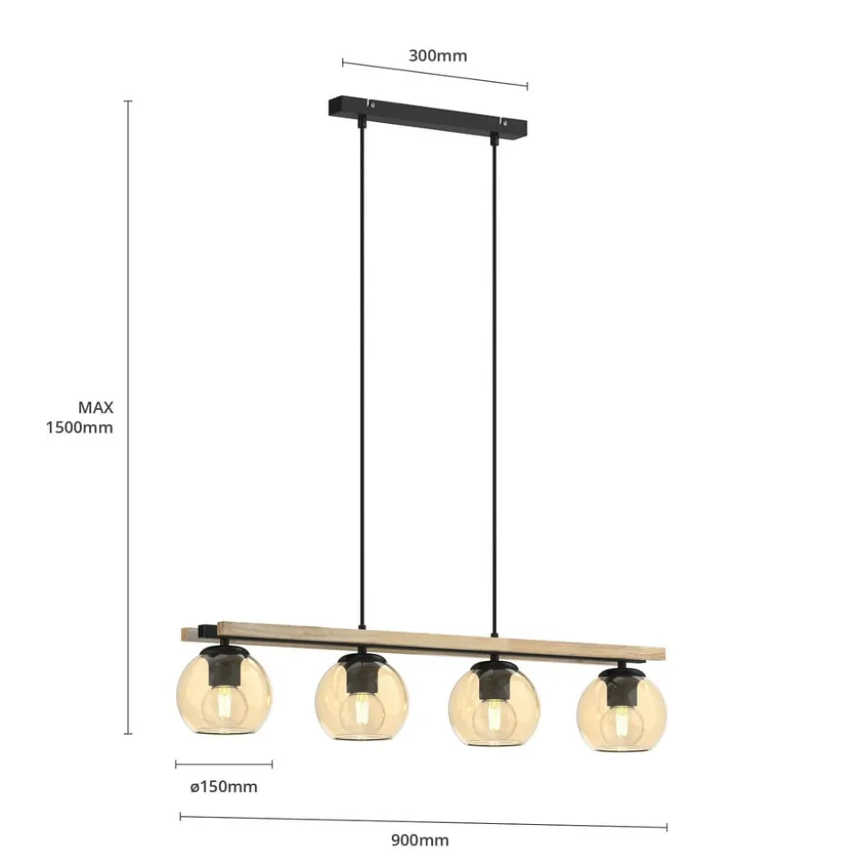 4-lamps hanglamp Enrique met houten balk en heldere glazen kappen in amber De houten balk waarop de vier glazen kappen van Enrique zitten, heeft een prachtig oppervlak in een lichte eikentint en de rest van het frame is gemaakt van mat zwart metaal. Deze onderdelen worden aangevuld door de vier kappen, die worden gekenmerkt door een warme amberkleur en de elegante heldere glaslook. Dit creëert een aantrekkelijke vintage look en het lichteffect profiteert ook van de prachtige kleur van de kappen. Een eettafel in de keuken of woonkamer kan prachtig en sfeervol worden verlicht met de hanglamp Enrique. Let bij het gebruik van de lamp op bijpassende lampen, want die zijn door het heldere glas goed zichtbaar en maken een belangrijk deel uit van de uitstraling.