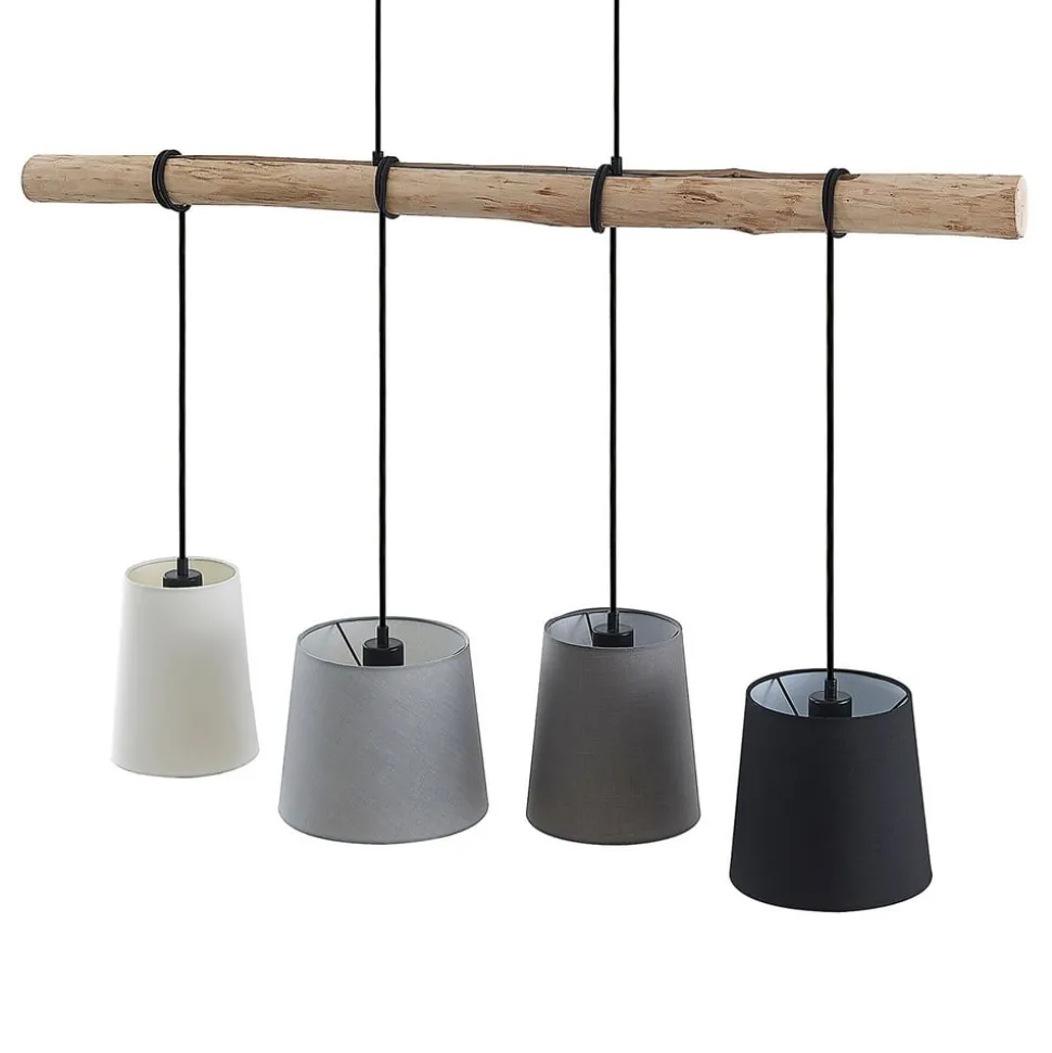 Hanglamp Hinai met een balk van eucalyptushout en vier lampenkappen van textiel De hanglamp Hinai valt op door de interessante combinatie van materialen. Vier textiele kabels zijn rond een lange balk van eucalyptushout gewikkeld, waaraan de uiteinden van de cilindrische kappen zijn bevestigd. De kappen zijn ontworpen in zwart, wit, donkergrijs en lichtgrijs en werken zeer harmonieus met elkaar. De hoogte van de afhanghoogte van elke afzonderlijke kap kan op elk moment worden gewijzigd. Deze lamp brengt iets heel bijzonders in de woon- en eetkamer.
