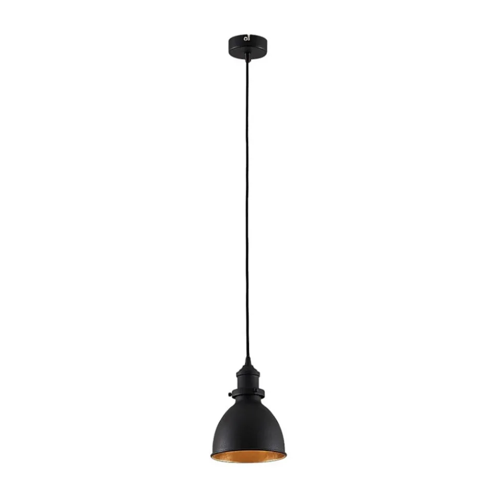 Jasminka metalen hanglamp met gouden binnenkant – perfect voor tafel- en balieverlichting Jasminka is een industrieel ogende metalen hanglamp die wordt gekenmerkt door een prachtige buitenkant. Aan de buitenkant is het metalen oppervlak zwart, terwijl de binnenkant van de kap een aantrekkelijke gouden tint heeft die niet alleen voor een mooi kleurcontrast zorgt, maar ook een uitzonderlijk warme en gezellige gloed uitstraalt. Jasminka kan als hanglamp boven een tafel worden geplaatst, die dan gezellig wordt verlicht, of als alternatief worden gebruikt om een toonbank te verlichten. Voor dit soort gebruik is het aan te raden om meerdere lampen achter elkaar te installeren om niet alleen een effectievere uitstraling, maar ook een uitgebreidere verlichting te creëren.