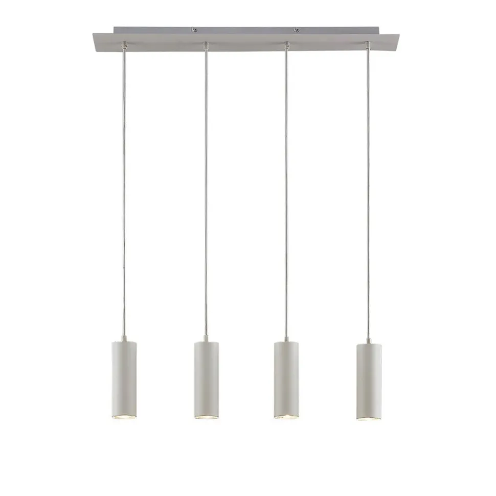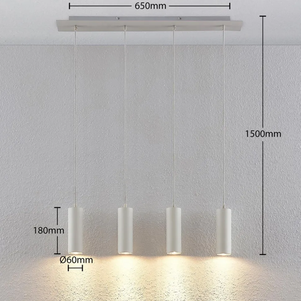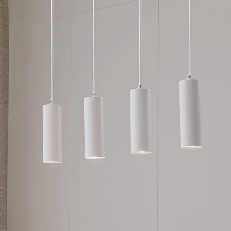 4-lamps hanglamp Joffrey in wit De hanglamp Joffrey wordt vooral gekenmerkt door minimalisme en eenvoud, maar heeft toch een zeer aantrekkelijke uitstraling. De vier witte kappen hebben een langwerpige cilindrische vorm en zijn op een rij geplaatst. Daarom past de hanglamp perfect boven een lange eettafel of bar. Joffrey kan gecombineerd worden met een grote verscheidenheid aan stijlen – van klassiek tot modern – dankzij het eenvoudige ontwerp en de ingetogen kleurstelling.