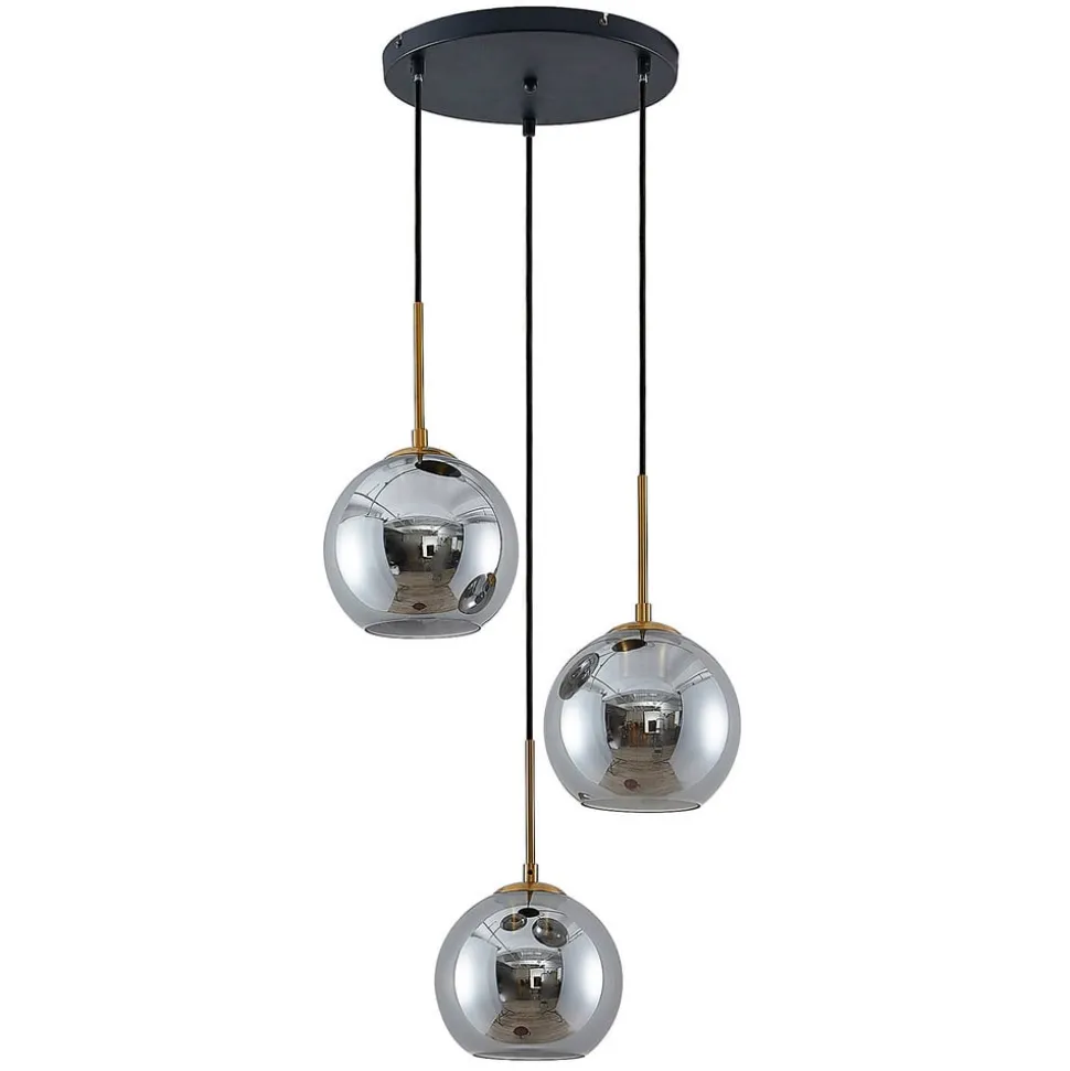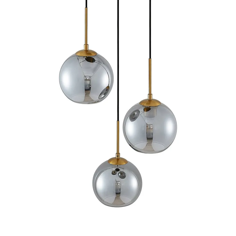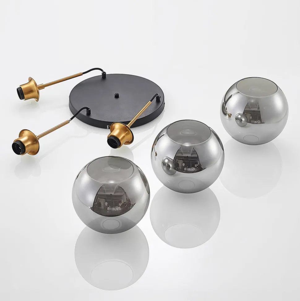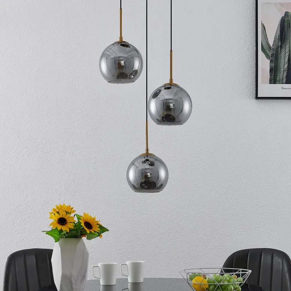 3-lamps Jurian hanglamp met rookgrijze glazen kappen en bronzen details Jurian heeft drie bolvormige kappen van rookglas die op verschillende hoogtes naar beneden in de kamer hangen. Dit creëert een licht en dynamisch effect en maakt de lamp ideaal voor montage boven een tafel in de woonkamer of eetkamer. De rookgrijze tint van het glas zorgt voor een gezellig licht en een elegante uitstraling, terwijl de lampen duidelijk zichtbaar blijven en daarom ook om decoratieve redenen moeten worden gekozen. Details in een mooie bronzen tint geven een stijlvolle touch aan het totale ontwerp en vintage inrichtingsstijlen kunnen ook prachtig gecombineerd worden met deze hanglamp.