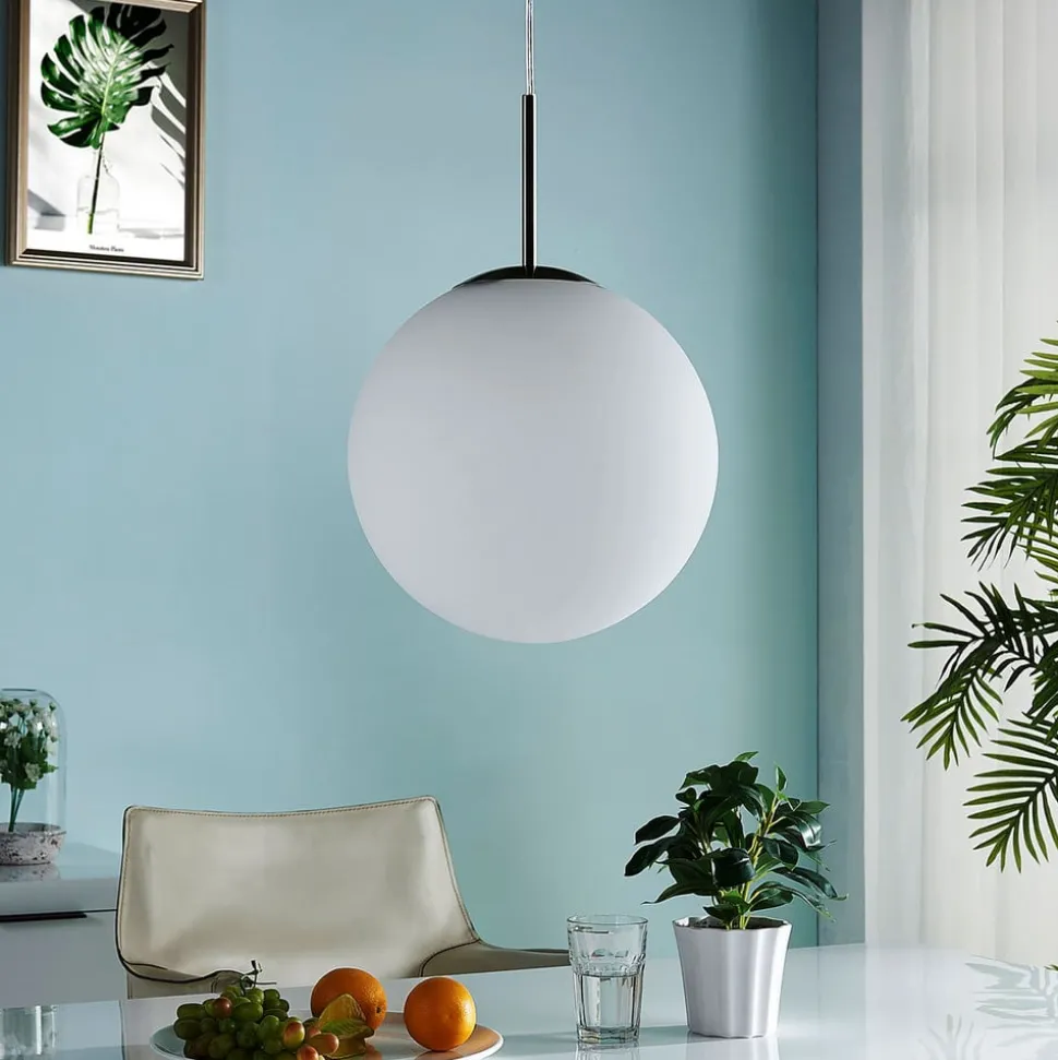Bolvormige hanglamp Marike van opaalglas met tijdloos mooie uitstraling Marike heeft een bolvormige glazen kap met een wit oppervlak, die op natuurlijke wijze het uiterlijk van de hanglamp domineert. Dankzij deze universele vorm en het universeel populaire materiaal glas in de verlichtingssector, is Marike een stijlvolle lichtbron van tijdloze schoonheid. Zelfs tientallen jaren geleden zagen dergelijke bolvormige hanglampen er modern en aantrekkelijk uit en dat zal in de toekomst zeker zo blijven, want een dergelijke gedetailleerde schoonheid is bijna onvergankelijk. De warme, gezellige gloed die uitgaat van de witte glazen kap draagt ook bij aan de bijzondere populariteit van deze klassieke lamp.