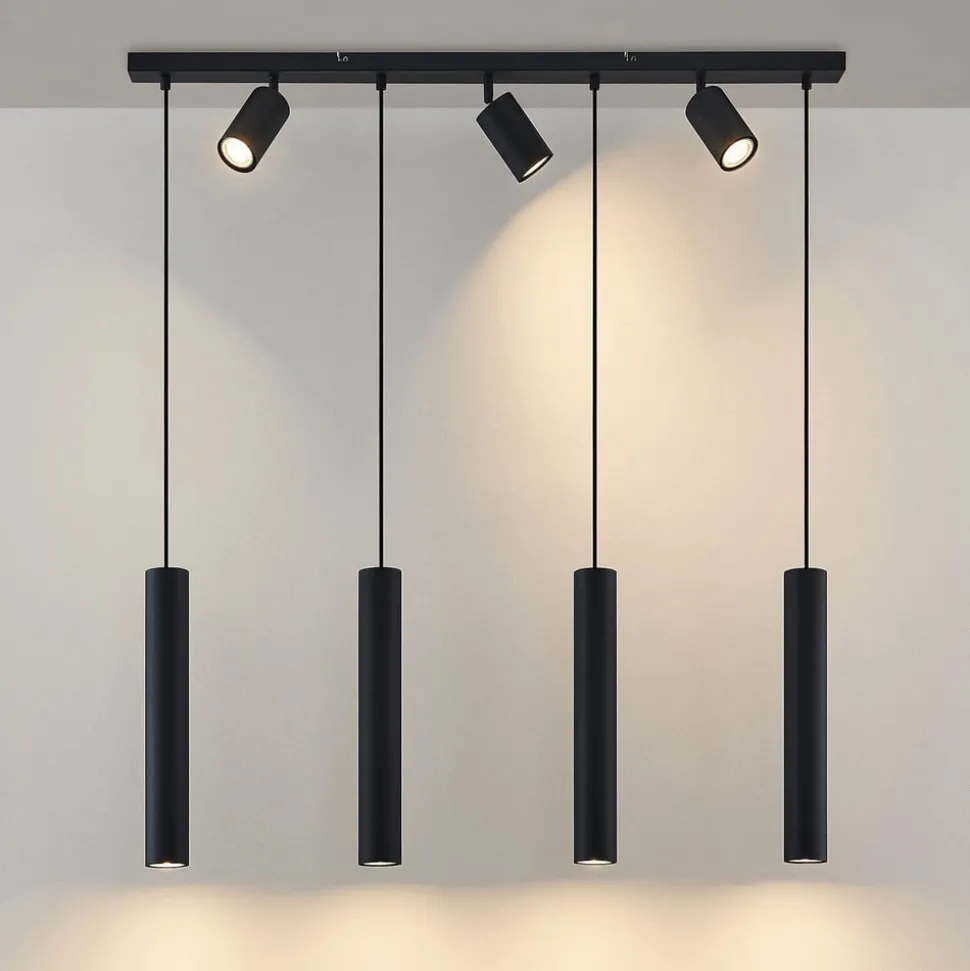7-lamps Sanad hanglamp van staal in effen zwart De Sanad hanglamp bestaat uit een langwerpige plafondhouder met in totaal zeven kappen. Vier daarvan hangen aan smalle ophangingen, terwijl drie de openingen tussen de ophangingen opvullen en rechtstreeks aan de plafondhouder zijn bevestigd. In deze kappen kunnen GU10 lampen worden gebruikt om het juiste licht voor een woonkamer te creëren. Het subtiele kleurenschema in rustig zwart en het strakke ontwerp integreren moeiteloos in de rest van het meubilair en vullen het mooi aan. De Sanad hanglamp maakt van elke kamer iets heel bijzonders en zorgt voor opvallende accenten op vlakke plafonds.