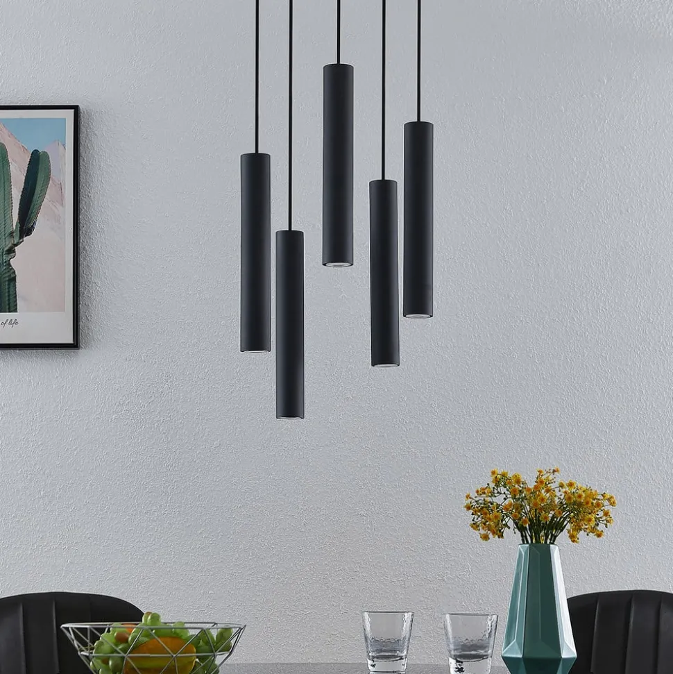 Hanglamp Sanad van staal in elegant zandzwart De hanglamp Sanad maakt indruk met haar stijlvolle uiterlijk en rustige kleurstelling. Vijf kappen zijn elk afgehangen aan een ronde plafondhouder. De verschillende lengtes van de kabels waaraan de kappen zijn bevestigd, geven het armatuur een interessante uitstraling. Wanneer ze zijn uitgerust met GU10 lampen, zorgen ze voor een betrouwbare en passende verlichting. De donkerzwarte kleur geeft de Sanad hanglamp een elegant ontwerp dat harmonieuze accenten legt op vlakke plafonds. Ze integreren moeiteloos in moderne inrichtingsstijlen en vormen een gunstige aanvulling op de rest van het meubilair.