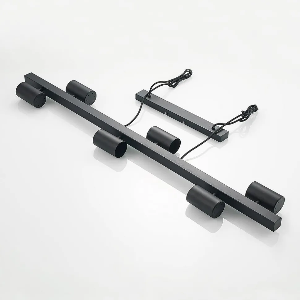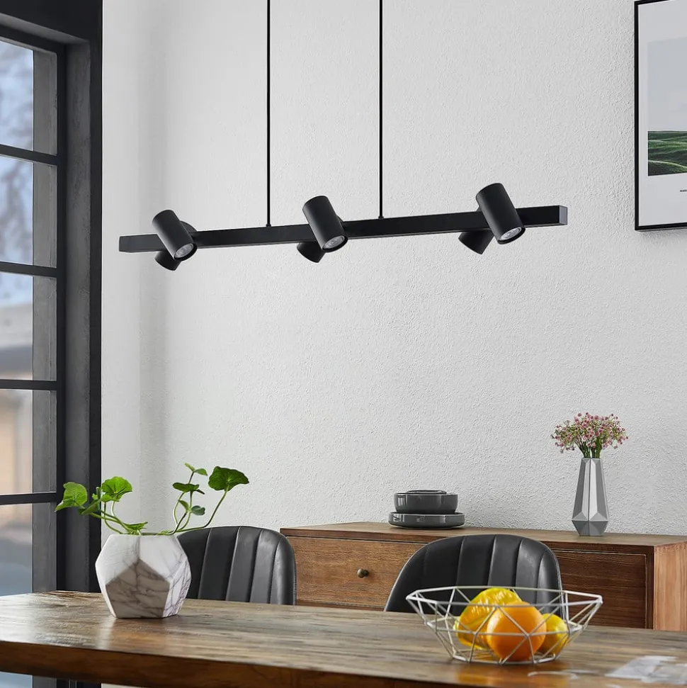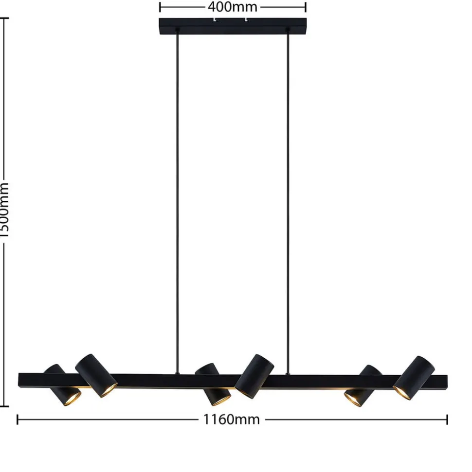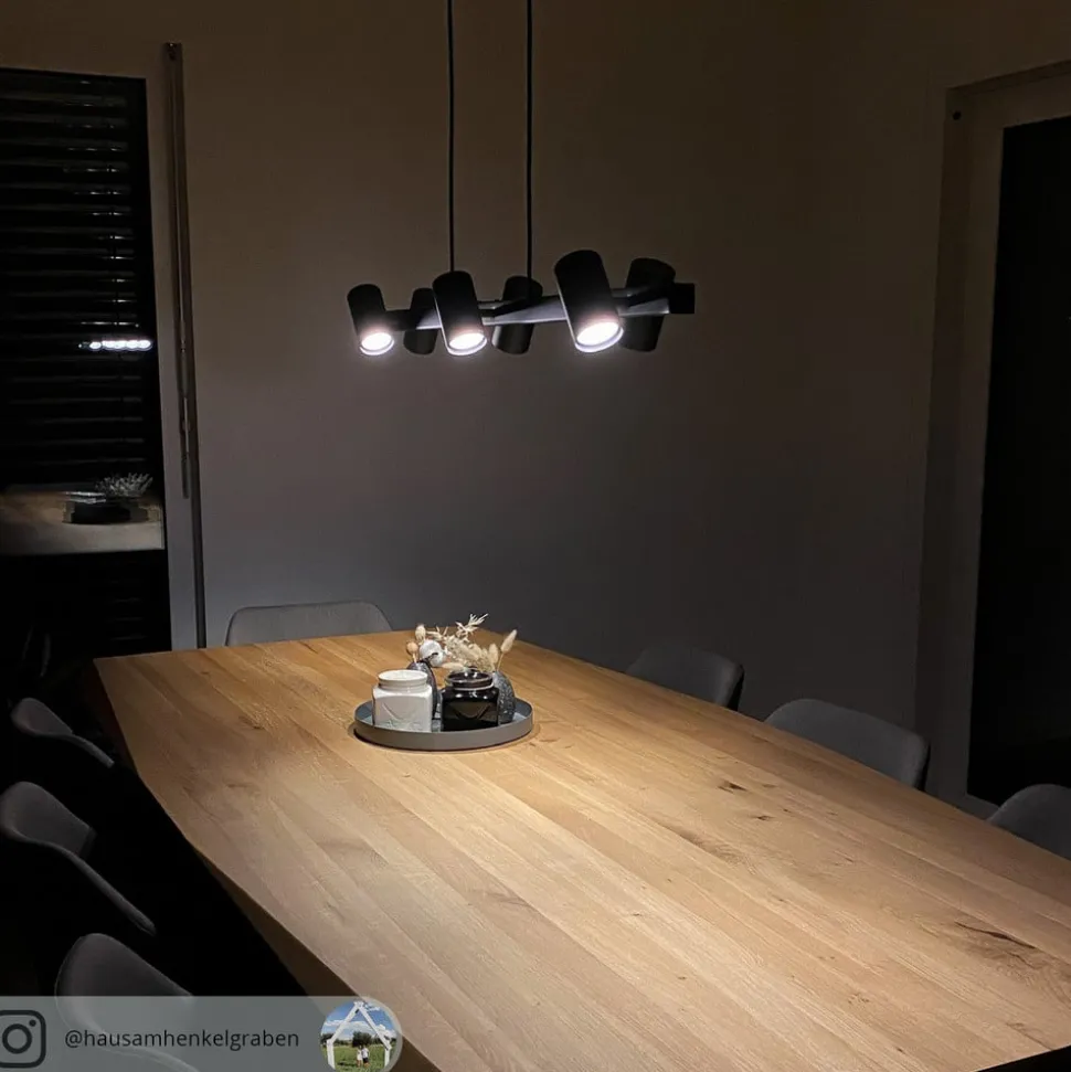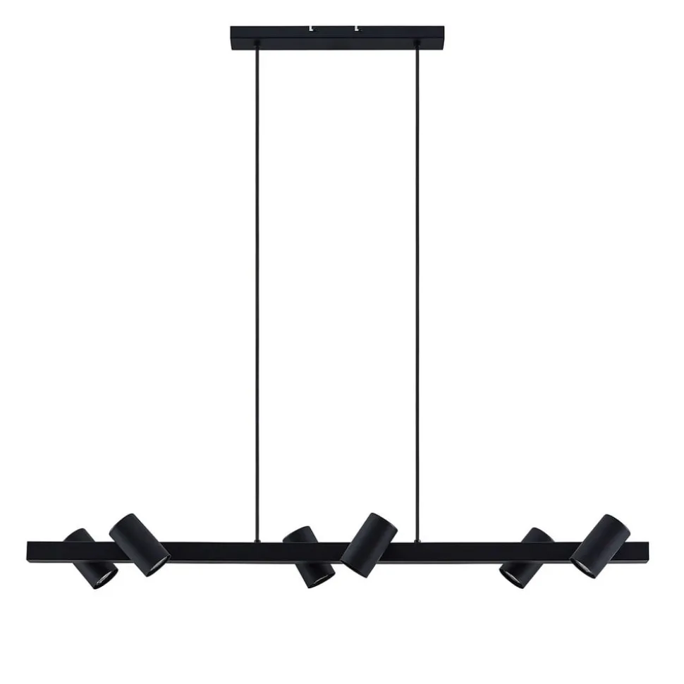 Moderne hanglamp Savoli met zes flexibele lichtbronnen De hanglamp Savoli maakt indruk met haar minimalistische vorm en toch opvallende ontwerp. Het ontwerp van het armatuur is minimalistisch in detail, zodat de afhanghoogte een eenvoudig karakter heeft en de langwerpige stalen balk, waaraan de zes lichtbronnen zijn bevestigd, een functioneel karakter heeft. De kappen zijn cilindervormig en stralen hun licht direct naar beneden uit. Hun positie kan desgewenst echter worden veranderd, waardoor het lichtontwerp in de ruimte kan worden aangepast aan individuele eisen. Savoli is een stijlvolle lichtbron boven een balie of eetkamertafel.