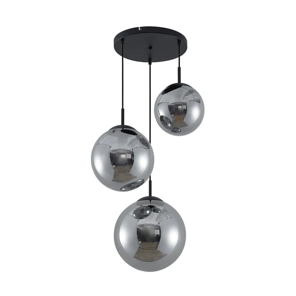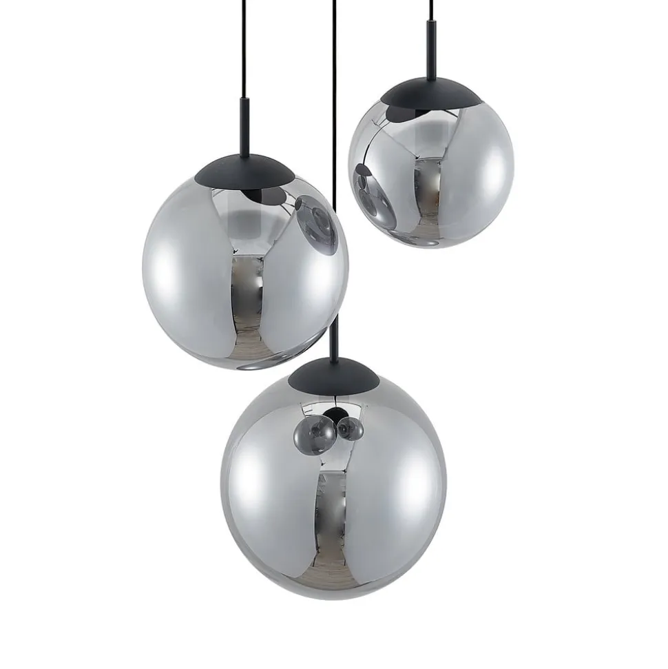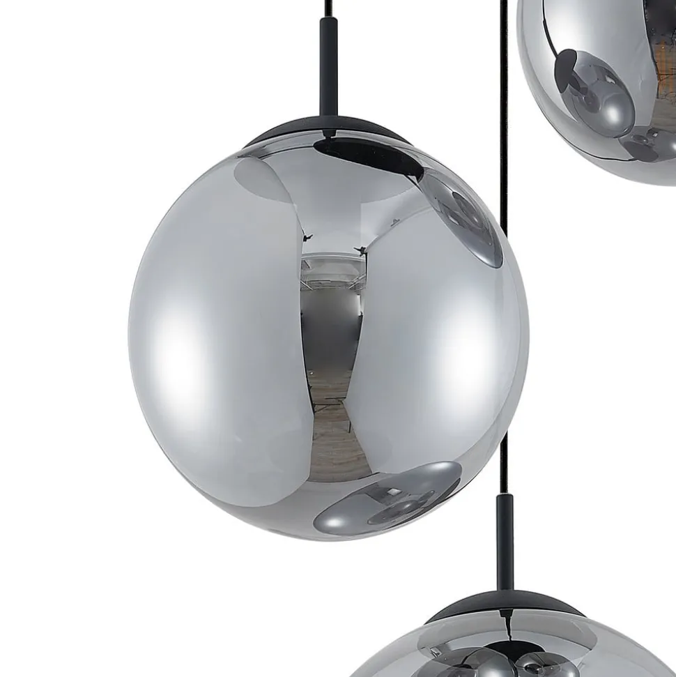 3-lamps Teeja hanglamp met glazen bollen in rookgrijs Teeja past goed in moderne interieurs, maar heeft ook een GEWISSelde vintage charme met zijn rookgrijze bollen. Deze zijn gemaakt van helder glas en zijn dus relatief transparant, wat zowel te zien is als de lamp aan- als uitgeschakeld is. Daarom moeten decoratieve lampen worden gebruikt die het algemene uiterlijk van de hanglamp stijlvol benadrukken, zoals gloeilampen of traditionele gloeilampen, die zijn ontworpen in de stijl van oude gloeilampen maar meestal efficiënte LED technologie hebben. De hanglamp is een elegante lichtbron voor de woonkamer en kan bijvoorbeeld aan de eet- of salontafel worden gebruikt. De bollen hangen op verschillende hoogtes aan de zwarte plafondplaat en creëren zo een bijzonder dynamische en individuele look.