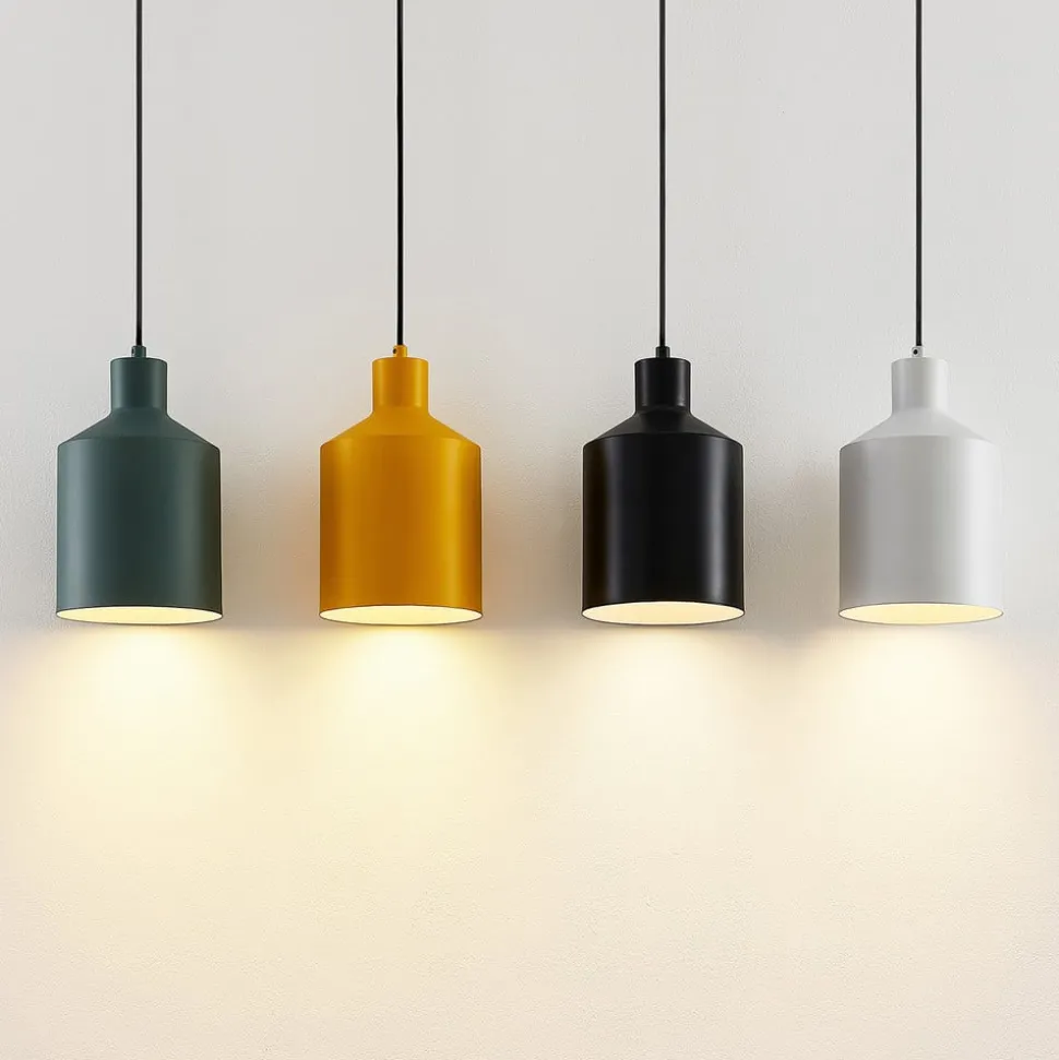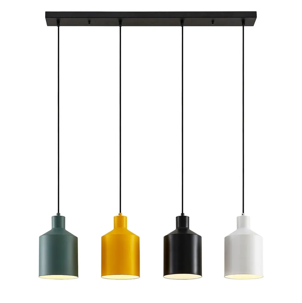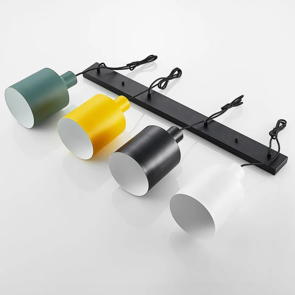 Hanglamp Tirane met kleurrijke glazen kappen De verschillende kleuren van hanglamp Tirane vullen elkaar aan tot een geslaagd totaalconcept. De kappen zijn al indrukwekkend als je ze afzonderlijk bekijkt. Maar samen ontvouwen ze hun volledige pracht en vooral de gele kap valt op. Hij ziet er helder en vriendelijk uit en kan worden gebruikt om een speciaal accent te creëren in elke moderne woonkamer. De andere drie kappen, met hun gedempte, donkere kleuren, dienen als visueel tegenwicht voor het felle geel. De kleuren harmoniëren perfect.