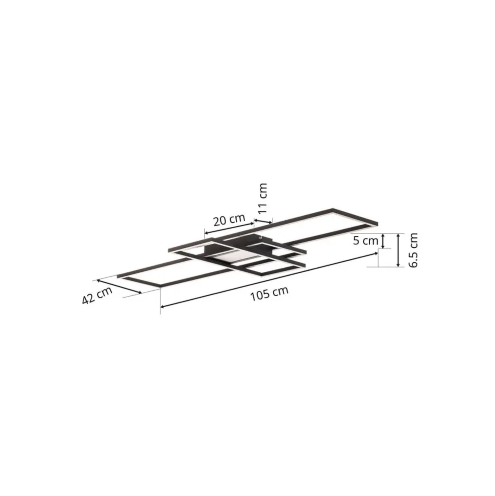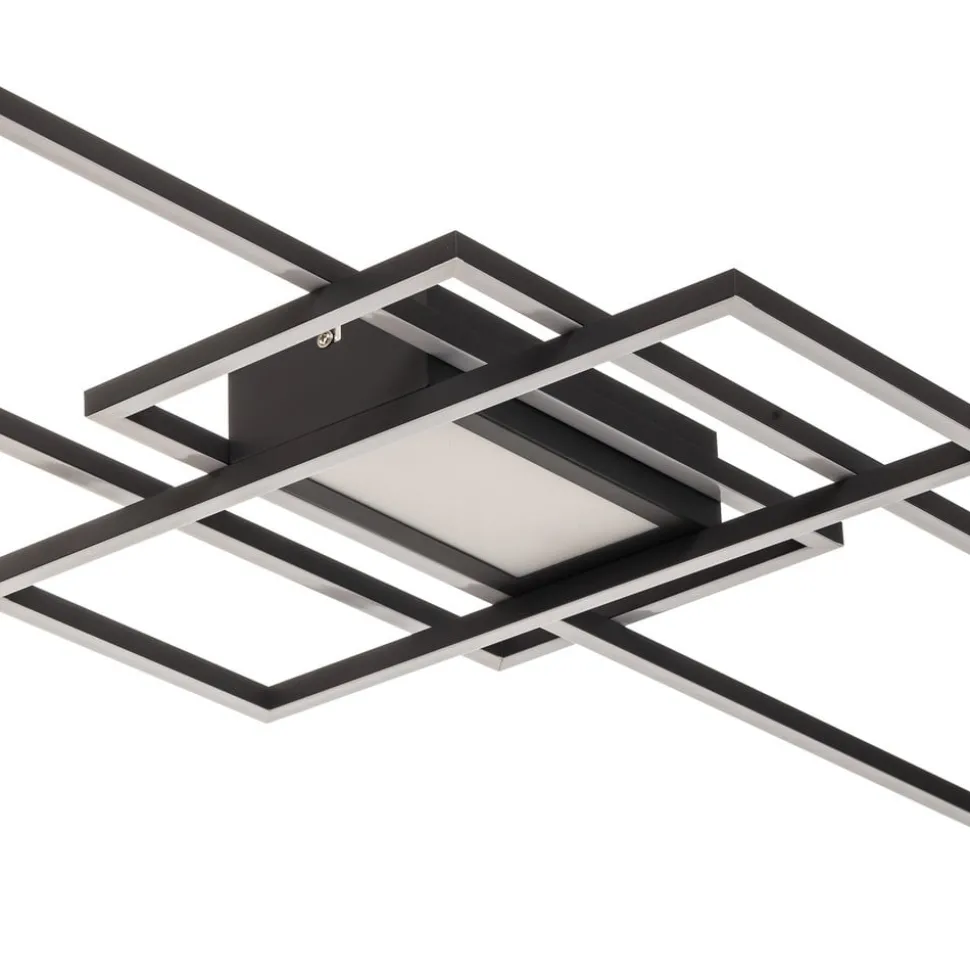 Zwarte Ismera LED plafondlamp met afstandsbediening, CCT, dimbaar Een hoekig ontwerp bestaande uit vele rechthoeken kenmerkt de look van de Ismera plafondlamp. Het armatuur met een rechthoekige baldakijn en drie aluminium profielframes van verschillende afmetingen heeft een matzwarte afwerking die de moderne look versterkt. Achter gesatineerde kunststof afdekkingen zijn LED’s geïnstalleerd in zowel de baldakijn als de frames, die variabel kunnen worden aangepast wat betreft hun lichtverdeling. De lichtkleur kan worden geselecteerd van 3.000 K tot 6.500 K met behulp van de meegeleverde afstandsbediening en de helderheid kan traploos worden gedimd. Deze flexibiliteit maakt de Ismera plafondlamp tot een allround talent. Dankzij haar formaat en hoge lichtopbrengst verlicht ze ook grote ruimtes perfect.