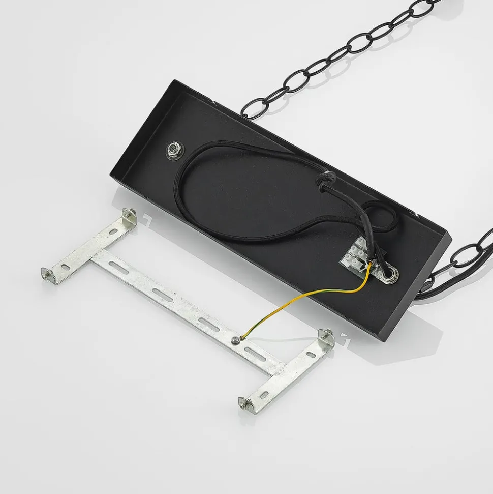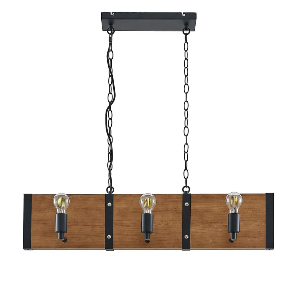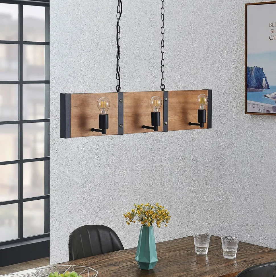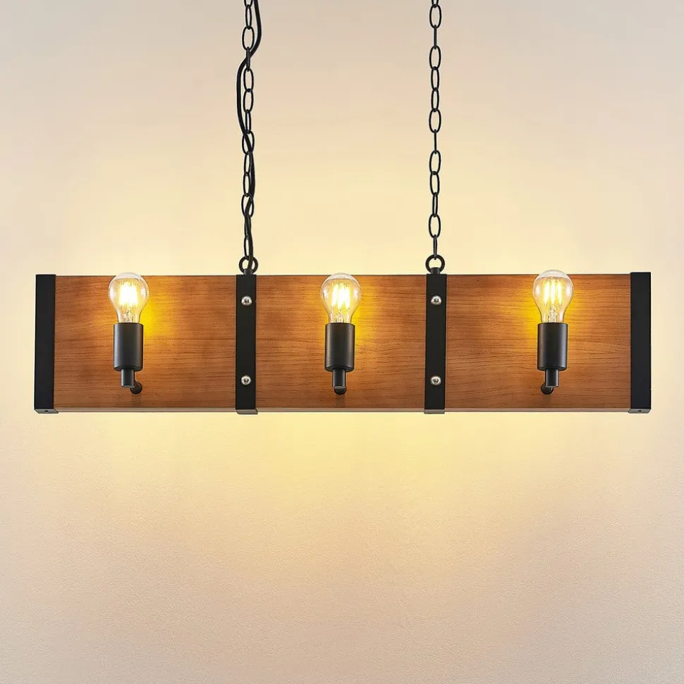 Deze pendelarmatuur met de centrale grenenhouten plaat belichaamt iets rustieks en straalt tegelijkertijd iets warms en uitnodigends uit. Het bord heeft drie E27 lamphouders aan elke zijde, die kunnen worden voorzien van lampen naar keuze en samen een passende lichtsterkte kunnen produceren. Technisch gezien zijn LED-lampen hier altijd up-to-date omdat ze weinig stroom verbruiken en een lange levensduur hebben. Visueel gezien moet u echter gaan voor het bekende gloeilampdesign voor een passende aanvulling op het uiterlijk. Beide kenmerken worden gecombineerd in de zogenaamde gloeilampen. Met zijn langwerpige vorm en verlichting aan beide zijden is de Kamilja houten hanglamp uitstekend geschikt voor het verlichten van eetkamers en grotere keukentafels.