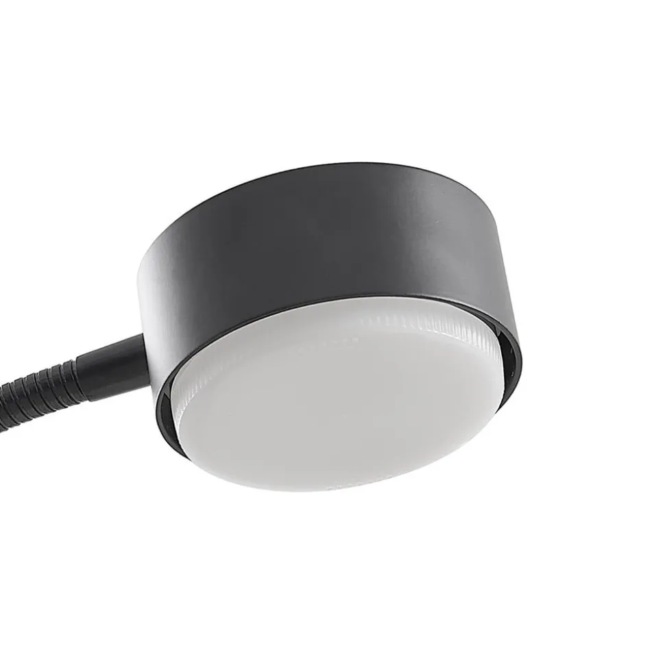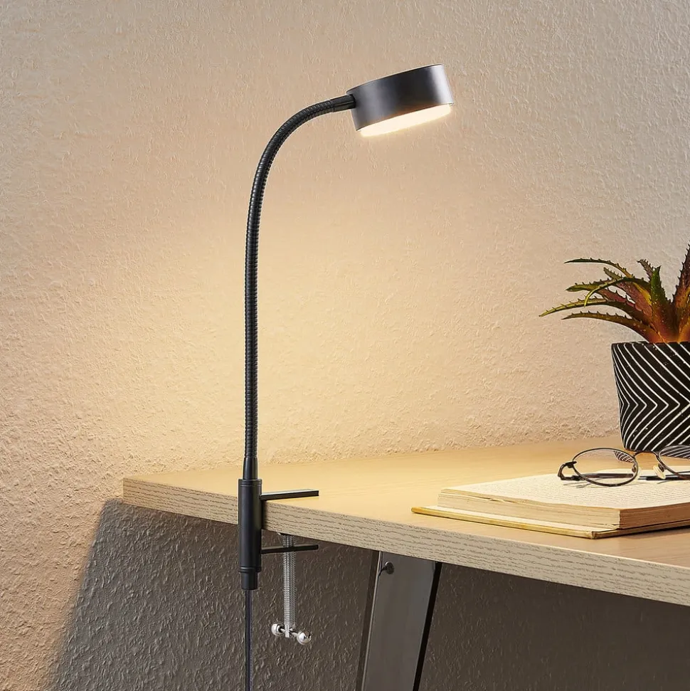 Zwarte Kaylou klemlamp met flexibele arm en schroefklem Deze klemlamp kan worden gebruikt om een tafel of plank te verlichten, waarbij hij stevig en stevig wordt bevestigd met een schroefklem en dus een goede houvast heeft. De arm is flexibel en kan in elke denkbare richting worden gedraaid om het licht precies te richten. Indirecte verlichting is net zo goed mogelijk als gerichte verlichting van een specifiek gebied. De schakelaar bevindt zich in de voedingskabel.