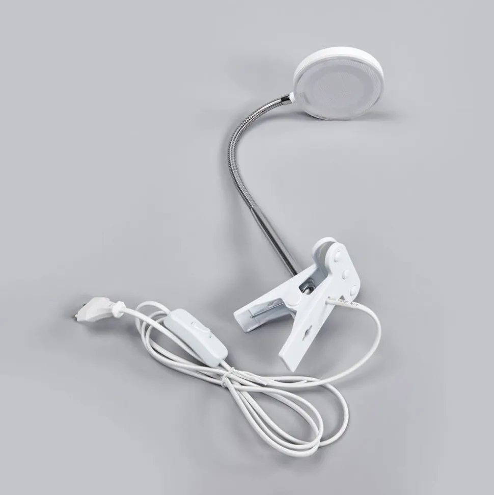 Praktische LED klemlamp Milow in wit Milow kan dankzij de klemfunctie aan de rand van een tafel worden bevestigd, maar is ook geschikt voor gebruik op een plank. Er zijn gewoon plaatsen waar het niet mogelijk is om een lamp op een andere manier stevig vast te houden of waar er gewoon niet genoeg ruimte is voor een tafelvoet. In zulke gevallen kun je overwegen om een LED klemlamp aan te schaffen, omdat deze duidelijke voordelen biedt. De Milow klemlamp heeft energiezuinige LED lampen en de ronde lampenkop heeft een vlakke en puristische uitstraling. Dankzij de flexibele arm kan de lamp naar wens worden gedraaid en kan het lichtpatroon worden aangepast. De tuimelschakelaar bevindt zich in de voedingskabel.