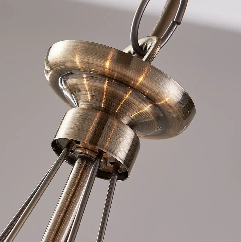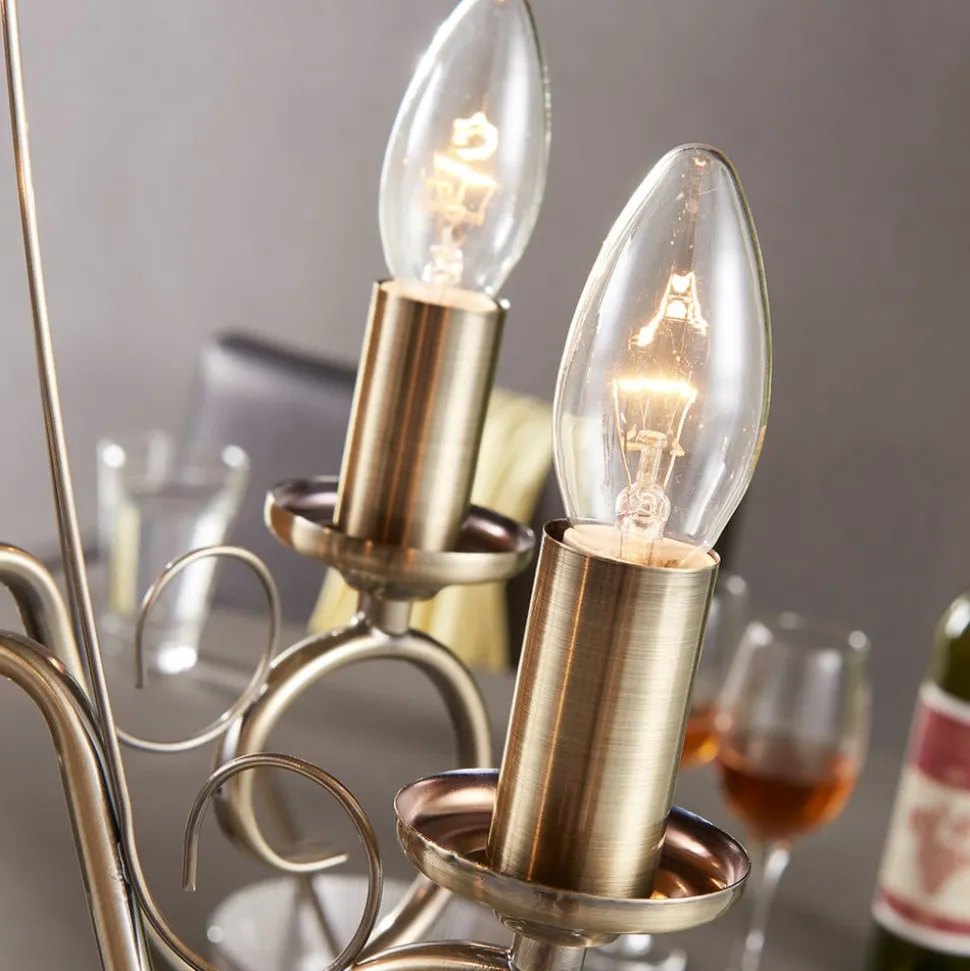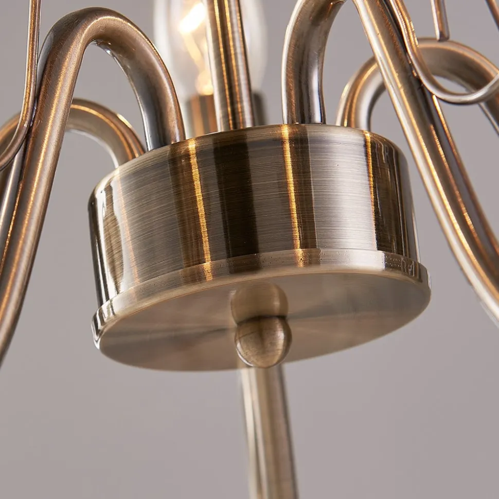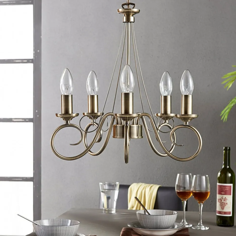 5-lamps Marnia kroonluchter met romantische uitstraling Deze kroonluchter doet sterk denken aan de klassieke kroonluchters van weleer, misschien zelfs die nog met echte waskaarsen werden bediend. Dit creëert ongetwijfeld een nostalgische, zo niet antieke uitstraling die veel kijkers zal aanspreken die hun woonruimte willen inrichten met de grandeur van klassieke lusters. Het bijzondere hier is dat het frame volledig van metaal is en er geen andere materialen in het uiterlijk zijn verwerkt. De afwerking met antiek messing benadrukt de antieke look en de prachtige ranken lampenarmen geven Marnia een romantisch uiterlijk.