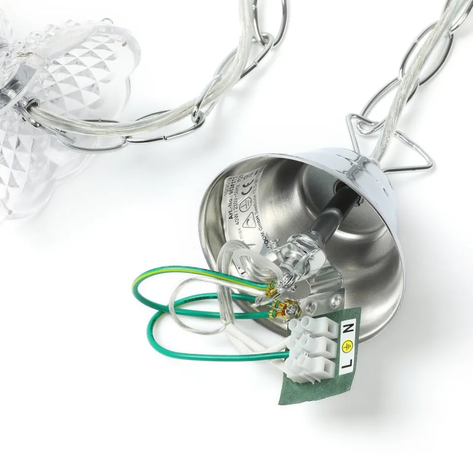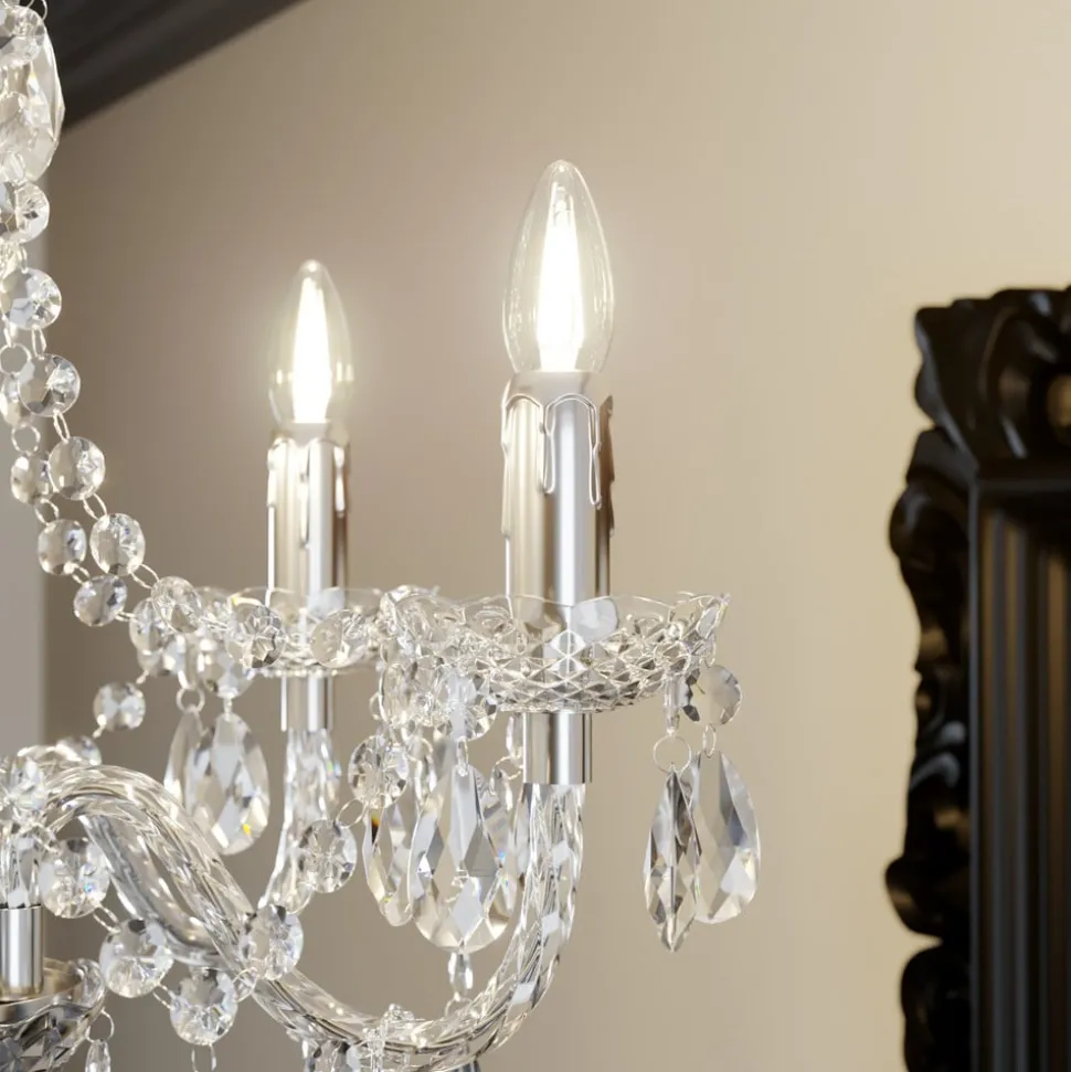Fonkelende kroonluchter Merida met glamoureuze ophanging De geschiedenis van kroonluchters gaat ver terug in de vorige eeuwen – naar tijden waarin er nog geen sprake was van elektrische verlichting. Toen werden ze meestal bediend met kaarsen, hoewel de installatie en ingebruikname met traditionele gloeilampen en andere elektrische lampen natuurlijk veel veiliger is en daarom tegenwoordig bijna uitsluitend de voorkeur geniet. Ook al kunnen kroonluchters terugkijken op zo’n lange geschiedenis, we lijken er nauwelijks genoeg van te hebben, omdat ze een prachtige fonkeling en glitter kunnen bieden die als bijna geen andere lichtbron fascineert en betovert. De Merida kroonluchter is er een met zulke afmetingen dat hij ook gemakkelijk kan worden geïntegreerd in privé woonruimtes. De lampenkap is gemaakt van helder acryl met een gepolijst oppervlak en creëert die bekende glinstering zodra hij in contact komt met licht en kan de lichtstralen met een glamoureus effect weerkaatsen. Merida is daarom een duurzame en effectieve toevoeging, niet in de laatste plaats in de eetkamer, waardoor de sfeer er een paar nuances verfijnder uitziet.