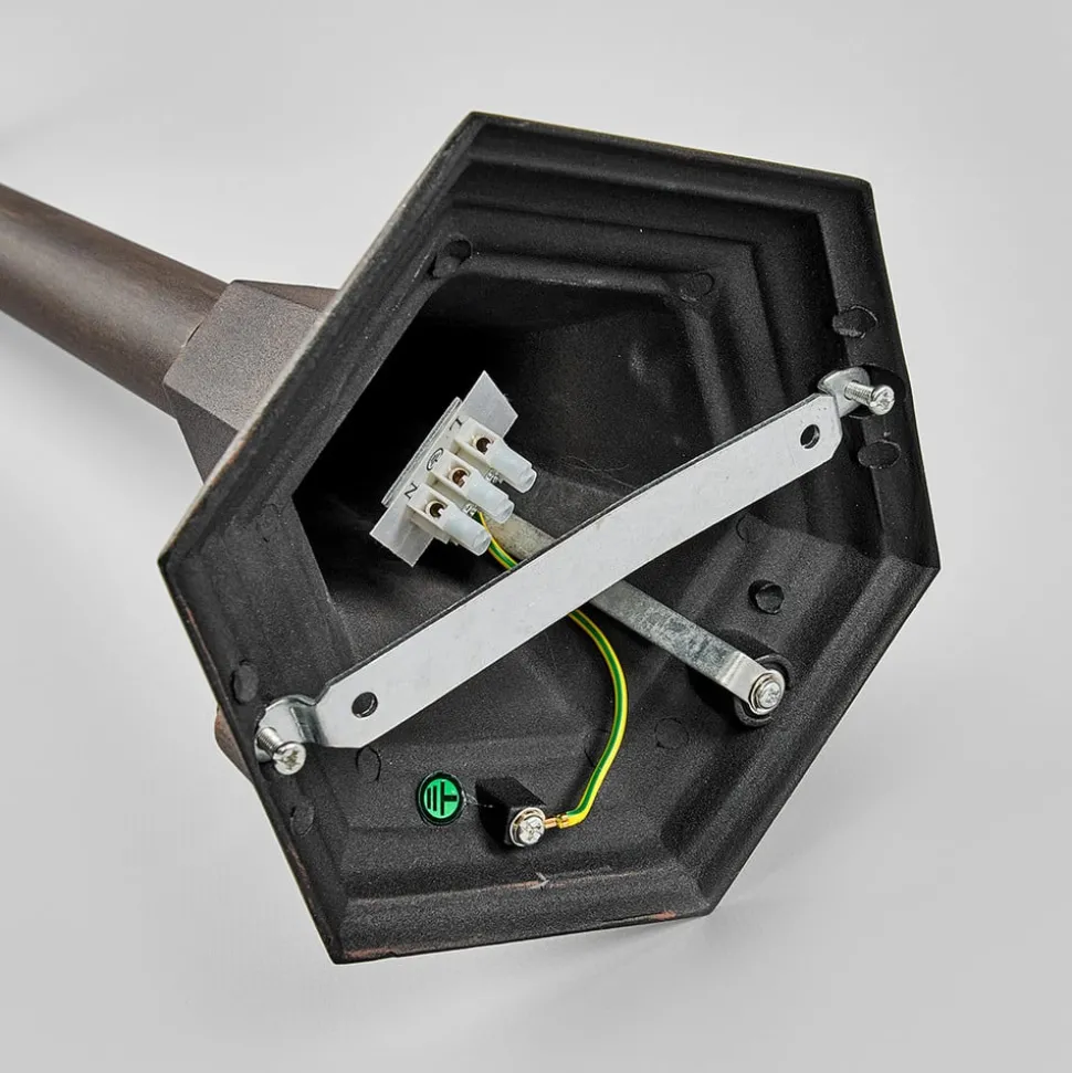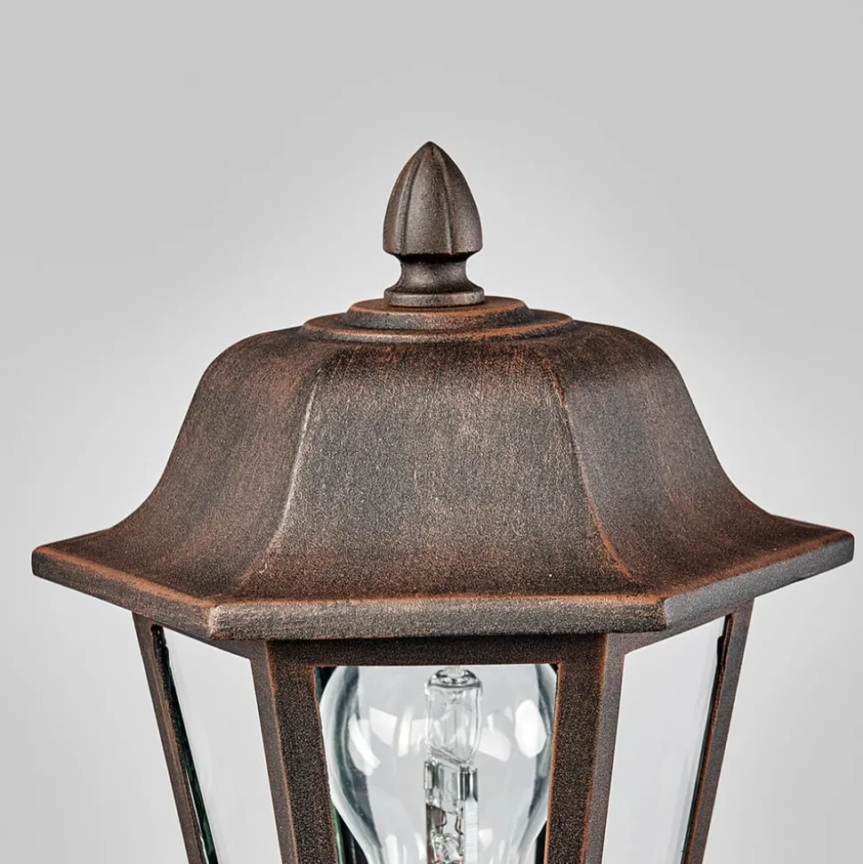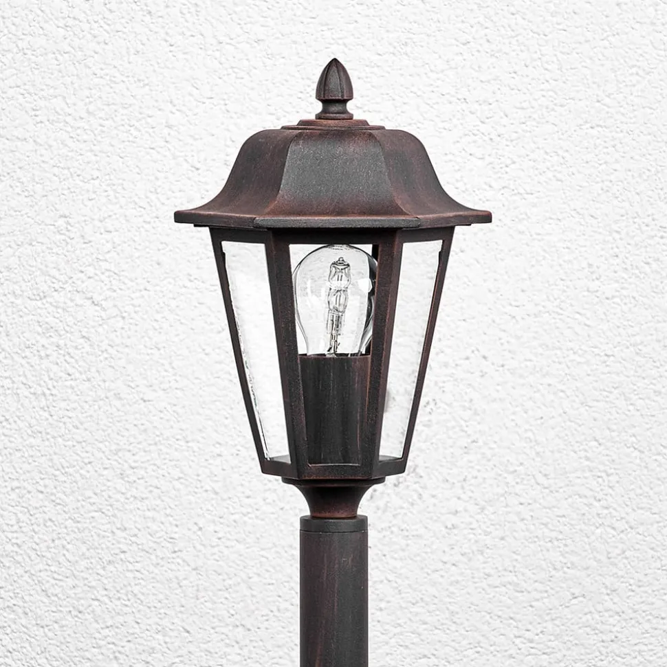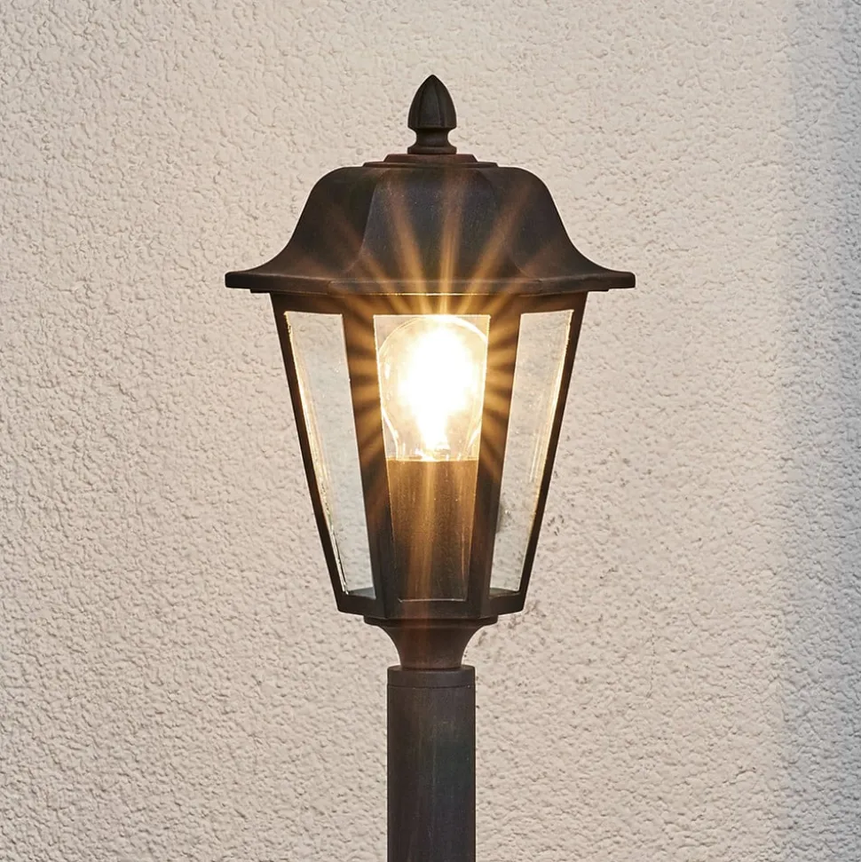 Roestbruine Lamina tuinpadverlichting met E27 fitting Met haar lantaarnvorm is deze tuinpadverlichting meer geschikt voor een klassieke sfeer, waarbij het roestbruine oppervlak van het frame haar een antiek tintje geeft. De kap doet inderdaad denken aan klassieke lantaarns, die eeuwen geleden met kaarsen werden verlicht om voor het nodige licht te zorgen. In de zijkant van de tuinpadverlichting zijn heldere glasplaten verwerkt om de lamp te beschermen. Hierdoor krijgen water en vuil nauwelijks een kans en kan het licht toch ongehinderd de omgeving binnendringen omdat de helderheid niet wordt verminderd.