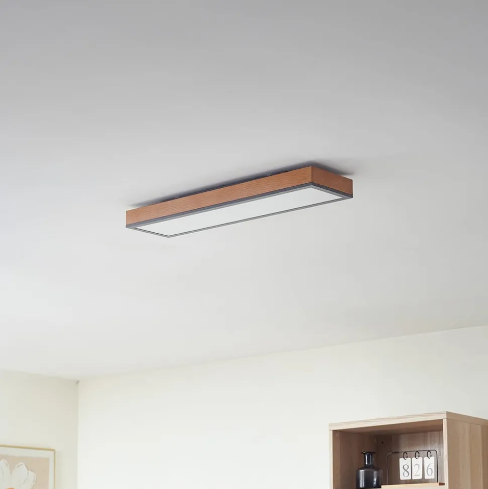 Rechthoekige LED plafondlamp Laviona met houtdecor voor moderne woonruimtes Laviona heeft een rechthoekig ontwerp en maakt indruk met haar stijlvolle behuizing van metaal en hout. Met haar lineaire look past deze platte LED plafondlamp heel goed in moderne woonruimtes en kan ze met haar krachtige LED’s ook in een hal worden gebruikt. Ze spot een aangenaam licht met een warmwitte lichtkleur en zorgt voor een goede sfeerverlichting in de kamer.