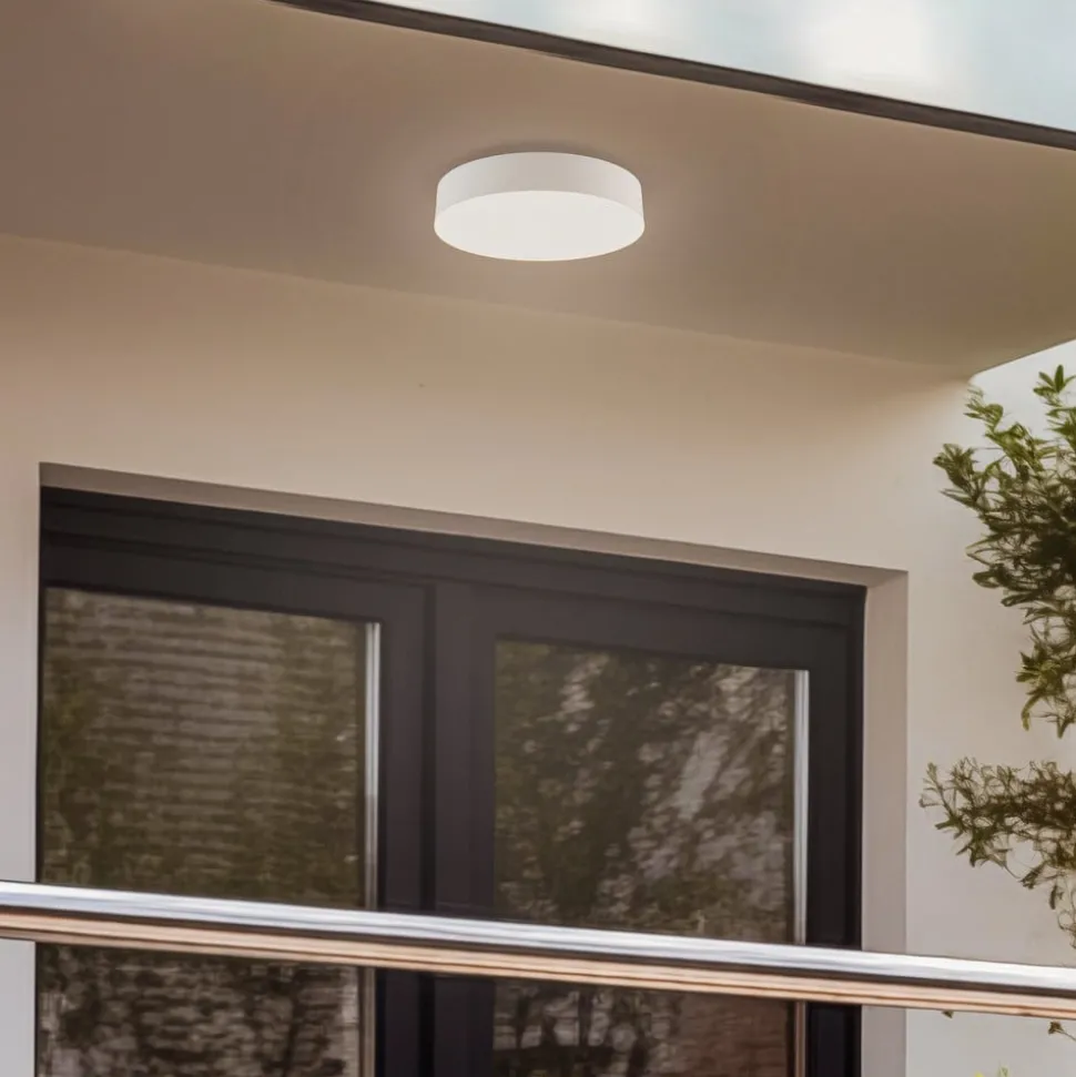 Ronde, witte LED plafondlamp Lahja met geïntegreerde bewegingsmelder, IP65, zeewaterbestendig Lahja past in veel buitenomgevingen en ziet er echt tijdloos uit met haar ronde vorm en witte afwerking, wat betekent dat de LED buiten plafondlamp op veel plaatsen kan worden gebruikt. Ze is ideaal voor de op de behoeften afgestemde verlichting van luifels voor de ingang van een huis, maar ook voor terrassen en balkons. De geïntegreerde sensor is erg praktisch omdat Lahja alleen wordt ingeschakeld als er iemand in de buurt is. Doorbekabeling is mogelijk en indien gewenst kan Lahja ook worden geïnstalleerd als plafondlamp voor buiten in de buurt van de zee, omdat de behuizing zeewaterbestendig is. Naast plafondmontage kan het armatuur ook aan de muur worden gemonteerd. Bijzonder robuust met slagvastheidsklasse IK06. Gegevens bewegingsmelder: – Bereik: 12 meter/6 meter – Detectiehoek 30°/150° – Maximale montagehoogte 6 meter – Lichtduur instelbaar: 5 seconden/90 seconden/5 minuten/15 minuten