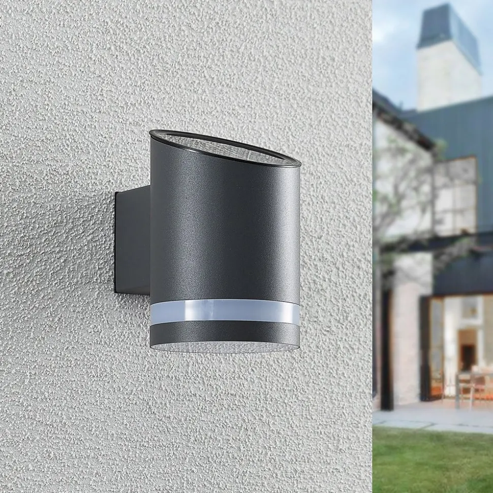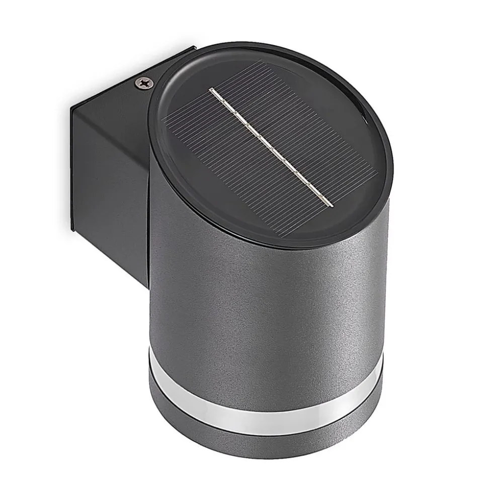 Antracietkleurige wandlamp op zonne-energie Bentlas van roestvrij staal, met LED-voeding Deze LED wandlamp maakt het mogelijk om licht te genereren in verschillende buitenomgevingen, zelfs als er bijvoorbeeld geen stroombron of aansluiting op het elektriciteitsnet is. Dit is mogelijk omdat de lamp aan de bovenkant een geïntegreerd zonnepaneel heeft, dat zonlicht eerst omzet in elektriciteit en vervolgens in licht. Dit betekent dat de Bentlas ook kan worden gebruikt op een mooi tuinperceel en bijvoorbeeld aan een kleine hut kan worden bevestigd om licht te geven wanneer dat nodig is als het al donker is. Het antracietkleurige oppervlak en de cilindrische vorm hebben een aangenaam tijdloze uitstraling en de lamp op zonne-energie Bentlas is ontworpen om in twee lichtstanden te werken, zodat het licht op volle of gereduceerde intensiteit kan schijnen. Afhankelijk van wat je kiest, varieert de maximale lichtduur tussen 20 en 35 uur wanneer de batterij volledig is opgeladen.