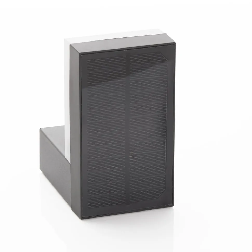 Lineaire LED buiten wandlamp Chioma op zonne-energie met sensor De LED buiten wandlamp Chioma is een absolute verrijking voor buitenruimtes, omdat ze schittert met vele functies. Het zonnepaneel bevindt zich aan de bovenkant en de lamp moet zo worden geïnstalleerd dat de zon er overdag voldoende kans op heeft, zodat de geïntegreerde batterij voldoende kan opladen na het omzetten van het zonlicht. Het ontwerp van de LED buiten wandlamp op zonne-energie is rechtlijnig en modern, het donkergrijze oppervlak heeft een tijdloze uitstraling en is ideaal voor het veelzijdige gebruik van Chioma. Het licht wordt naar beneden uitgestraald en er is ook een geïntegreerde sensor aan de wandzijde van het frame. De LED buiten wandlamp en de sensor kunnen in vier standen worden gebruikt: 1) Automatische lichtsterkte 75 lumen na schemering 2) Automatische lichtsterkte 75 lumen na schemering, korte helderheidsverhoging tot 400 lumen bij detectie van beweging 3) 600 lumen kort bij detectie van beweging, daarna uit 4) Uit Gegevens bewegingsmelder: – Detectiehoek 90 graden – Bereik 2 tot 6 meter – Lichtduur 25 seconden