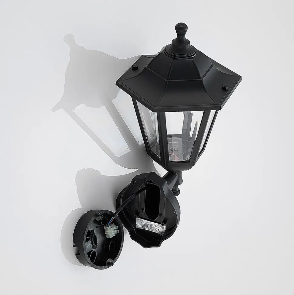 Lantaarnvormige LED buiten wandlamp Iavo met zwart oppervlak, zeewaterbestendig Iavo wordt aangedreven door energiebesparende LED’s en is een lichtbron voor buiten die een goede oriëntatie biedt. De kap kan zowel naar boven als naar beneden worden gemonteerd. Het algemene ontwerp van de buitenwandlamp doet onmiskenbaar denken aan de stijl van goede oude tuinlantaarns en straalt daarom nostalgische charme uit. De polycarbonaat inzetstukken zijn helder en het licht van de LED’s is helder en warmwit. De slagvastheidsklasse IK06 garandeert een hoge mate van robuustheid voor buitengebruik. De armatuurbehuizing wordt ook gekenmerkt door het feit dat deze zeewaterbestendig is en dus ook in de buurt van de zee met zoute lucht kan worden gebruikt.