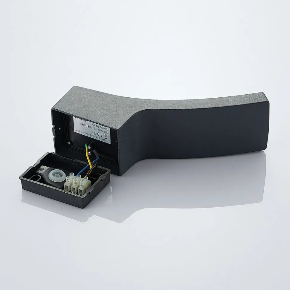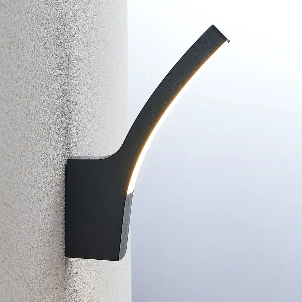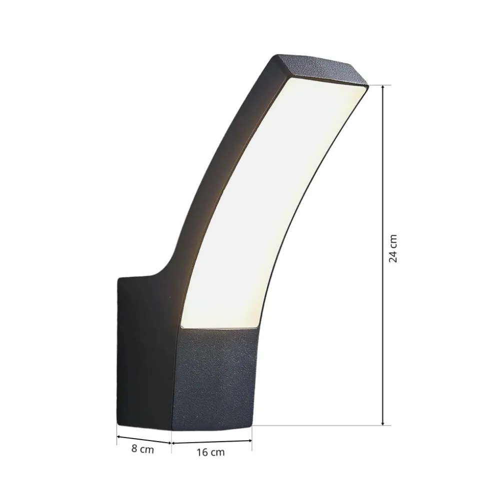 Antracietkleurige LED buitenwandlamp Ilvita in een gebogen vorm De licht gebogen vorm van de LED buitenwandlamp Ilvita laat het licht naar beneden schijnen, waardoor grondoppervlakken en andere gebieden goed worden verlicht. De LED’s bevinden zich achter een opaalwit polycarbonaat oppervlak zodat het licht zacht gedimd wordt en als aangenaam en zacht wordt ervaren. Het warmwitte LED licht maakt ook indruk met zijn lage energieverbruik en heldere verlichting, wat betekent dat het zeer energiezuinig is. Visueel past de minimalistische wandlamp voor buiten heel goed in een moderne sfeer.