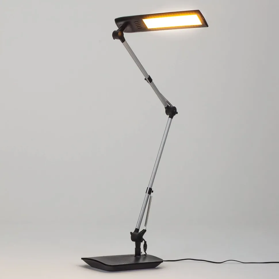 Functionele LED bureaulamp Felipe met klem en staander Wie op zoek is naar een iets professionelere vorm van verlichting voor zijn bureau thuis, doet er goed aan om voor de LED bureaulamp Felipe te kiezen, omdat deze aan veel verwachtingen voldoet en het werk dus veel gemakkelijker maakt als de optimale verlichtingssituatie kan worden gecreëerd. Het eerste punt dat moet worden vermeld, is dat de tafellamp niet alleen wordt geleverd met een conventionele voet, want de levering omvat ook een klemvoet met schroefklem, zodat Felipe ook op tafelbladen en planken kan worden gemonteerd. Bovendien zorgen verschillende scharnieren ervoor dat de lichtstraal optimaal kan worden uitgelijnd en een aanraakschakelaar, die ook een dimmer is, biedt de mogelijkheid van de ideale helderheidsinstelling, wat natuurlijk altijd een opmerkelijke eigenschap is en zowel helder werklicht als gedimde feelgood verlichting mogelijk maakt.