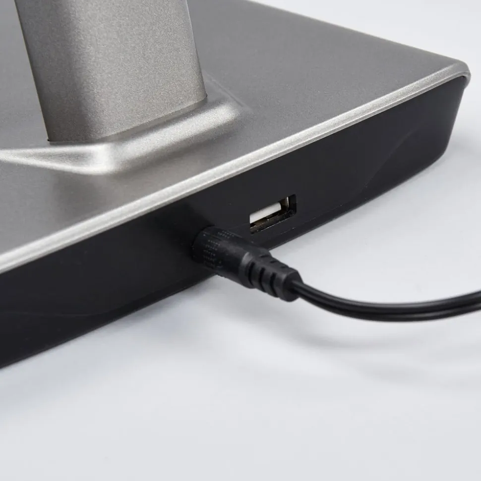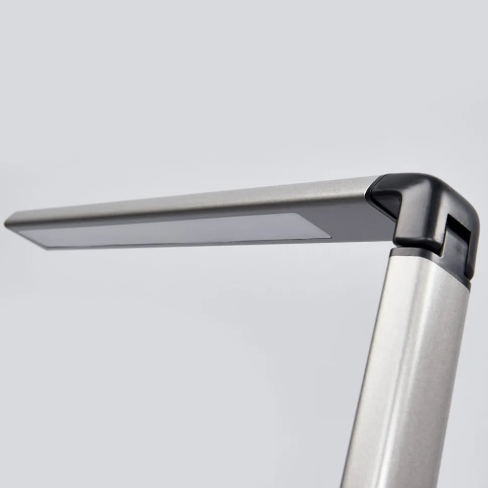Kuno LED tafellamp met USB oplaadstation en touch dimmer Het oppervlak van deze LED tafellamp voor op het bureau is metallic grijs en er is een touch schakelaar op de voet van de lamp, waarmee het licht ook gedimd kan worden. De helderheid van Kuno is bijzonder goed, maar de LED technologie verbruikt zeer weinig stroom, wat erg prettig is voor de consument. Een bijzonder praktisch kenmerk van de LED tafellamp is de USB-aansluiting, waarmee je je mobiele telefoon kunt opladen terwijl je je concentreert op je werk.
