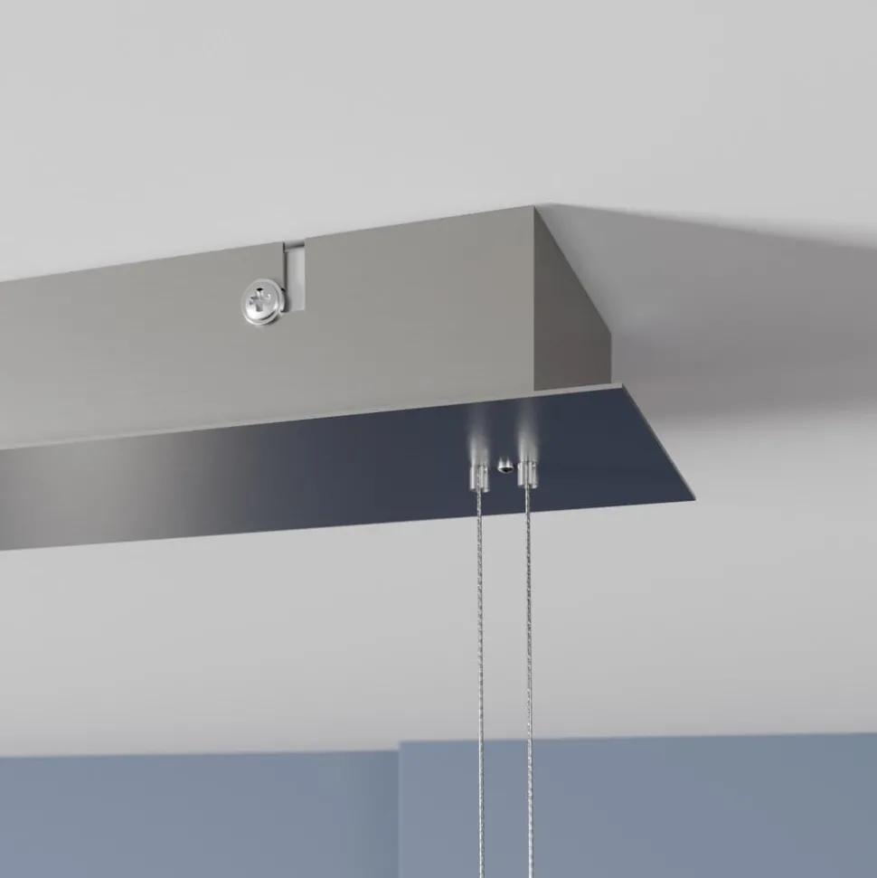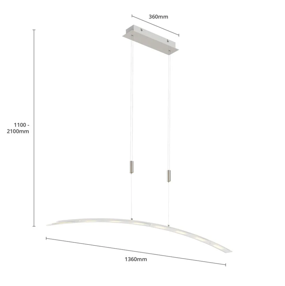 Warmwitte LED hanglamp Manon – ideaal voor de eetkamer Met haar warmwitte lichtkleur heeft het licht van deze in hoogte verstelbare LED hanglamp een heel gezellig effect. In totaal acht LED’s zijn gelijkmatig verdeeld langs de gebogen metalen staaf, waar ze worden afgedekt door een matglazen kap. De helderheid is uitzonderlijk goed, maar dankzij de LED-technologie staat dit geenszins gelijk aan een hoog energieverbruik. Integendeel, dit ligt op een laag niveau. Als je de hoogte van de afhanghoogte individueel wilt aanpassen, kan dat in een paar eenvoudige stappen, want het kabelmechanisme maakt het gemakkelijk om dit te doen van 110 cm tot 210 cm. De LED hanglamp Manon is een echte aanrader voor gebruik in de eethoek, want zowel de langwerpige vorm als de aanpasbaarheid in hoogte zorgen voor een perfecte verlichting van de eettafel.