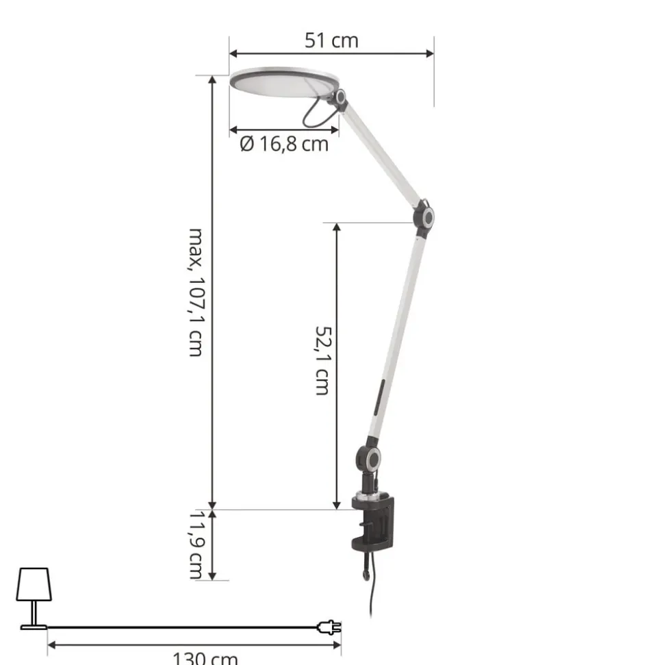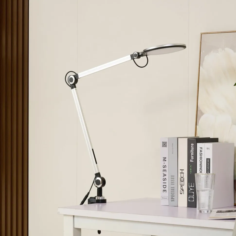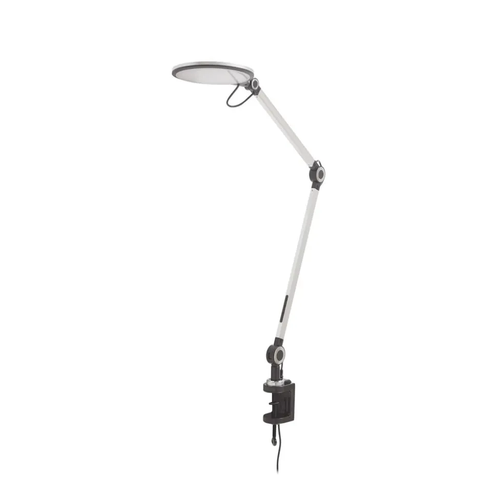 Nyxaris – een LED klemlamp met een praktische zwenkarm in zilverkleur De Nyxaris LED klemlamp is de perfecte metgezel als het gaat om het verlichten van een bureau. De lamp wordt met een klem aan het bureau bevestigd en dankzij de zwenkarm kan de verlichting flexibel worden aangepast. Nyxaris is dimbaar en de lichtkleur kan op drie niveaus worden ingesteld (warmwit, universeel wit en daglicht). Nyxaris is ideaal voor gebruik in een kantoor, omdat het niet alleen flexibele verlichting vereist, maar ook indruk maakt door zijn eenvoudige uiterlijk.