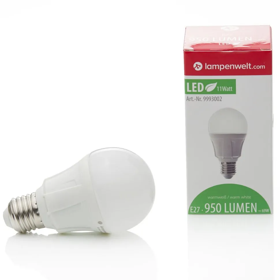 LED lamp E27 11 W Met zijn LED technologie zet deze lamp zijn voorgangers in de schaduw en heeft alleen de vorm gemeen met de klassieke gloeilamp. Deze LED lamp schijnt met een energiereductie van ongeveer 85%, terwijl de zeer lange levensduur van 30.000 uur garandeert dat je lang plezier hebt van de lichtbron en warmwit licht in je eigen vier muren brengt. Dankzij de E27 lampvoet kan hij in een handomdraai worden vervangen door conventionele E27 lampen – deze LED lamp is een vervanger voor maximaal 70 watt. Eigenschappen: – de kleur wordt zeer goed gereproduceerd (Ra 82) – heeft een vermogensfactor van > 0,6 – is niet dimbaar – wordt onmiddellijk helder – heeft een minimale opstarttijd van minder dan 1 seconde – behoud van de lichtstroom van de lamp ≥ 85 % bij 75 % van de gemiddelde levensduur