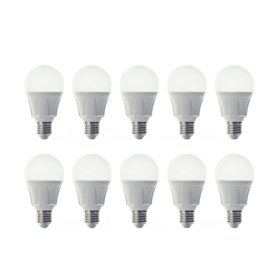 E27 8,5W LED lamp in gloeilampvorm, mat, warmwit in een set van 10 De vorm, die is aangepast aan een conventionele gloeilamp, en een warmwitte lichtkleur van 3.000 K maken deze LED lamp bijzonder geschikt voor gebruik in woonkamers en kantoren en vervangt een conventionele gloeilamp van maximaal 60 W. De lichtbron maakt indruk door zijn hoge efficiëntie in combinatie met een zeer laag energieverbruik, een zeer lange levensduur van maximaal 30 uur.technische gegevens: – Zeer efficiënte LED-technologie, tot 85% energiebesparing – Enorm lange levensduur tot 30.000 uur – Weinig UV- en warmtestraling – Kwikvrije productie – Dimbaar – Vermogensfactor > 0,58 – Behoud van de lichtstroom van de lamp ≥85% bij 75% van de gemiddelde levensduur – Geleverd in een praktische set van 10 lampen
