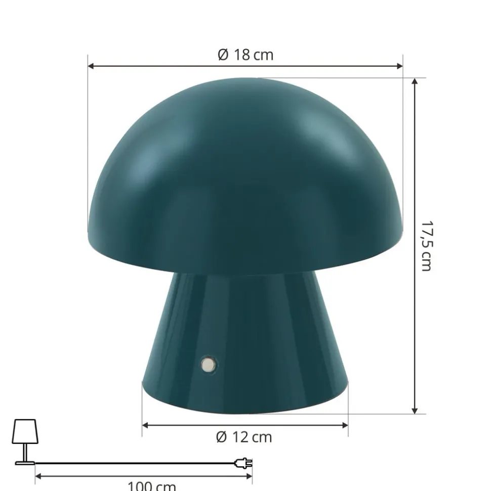 LED tafellamp Nevijo in paddenstoelvorm op batterijen met touchdimmer Deze tafellamp is een smaakvolle aanvulling op je verlichtingsconcept. Het aantrekkelijke uiterlijk maakt een aantal mogelijke toepassingen en combinaties mogelijk en kan effectief worden geïntegreerd in je interieur. De tafellamp straalt een gezellig warmwit licht uit in je woonkamer. De lamp kan gemakkelijk worden in- en uitgeschakeld met een schakelaar, is uitgerust met een dimmer voor een aangename sfeer en wordt geleverd in de kleur petrol. De tafellamp kan perfect worden geïntegreerd in je inrichtingsstijl en creëert een gezellige sfeer. Met deze lamp kies je voor bewezen Lindby kwaliteit. De tafellamp is gemaakt van ijzer. De stijlvolle uitstraling van de tafellamp geeft je woonruimte een gezellige sfeer die gemakkelijk bij al je bestaande decoratieve elementen past. Deze tafellamp maakt je interieur compleet – incl. 3,7V lithiumbatterij