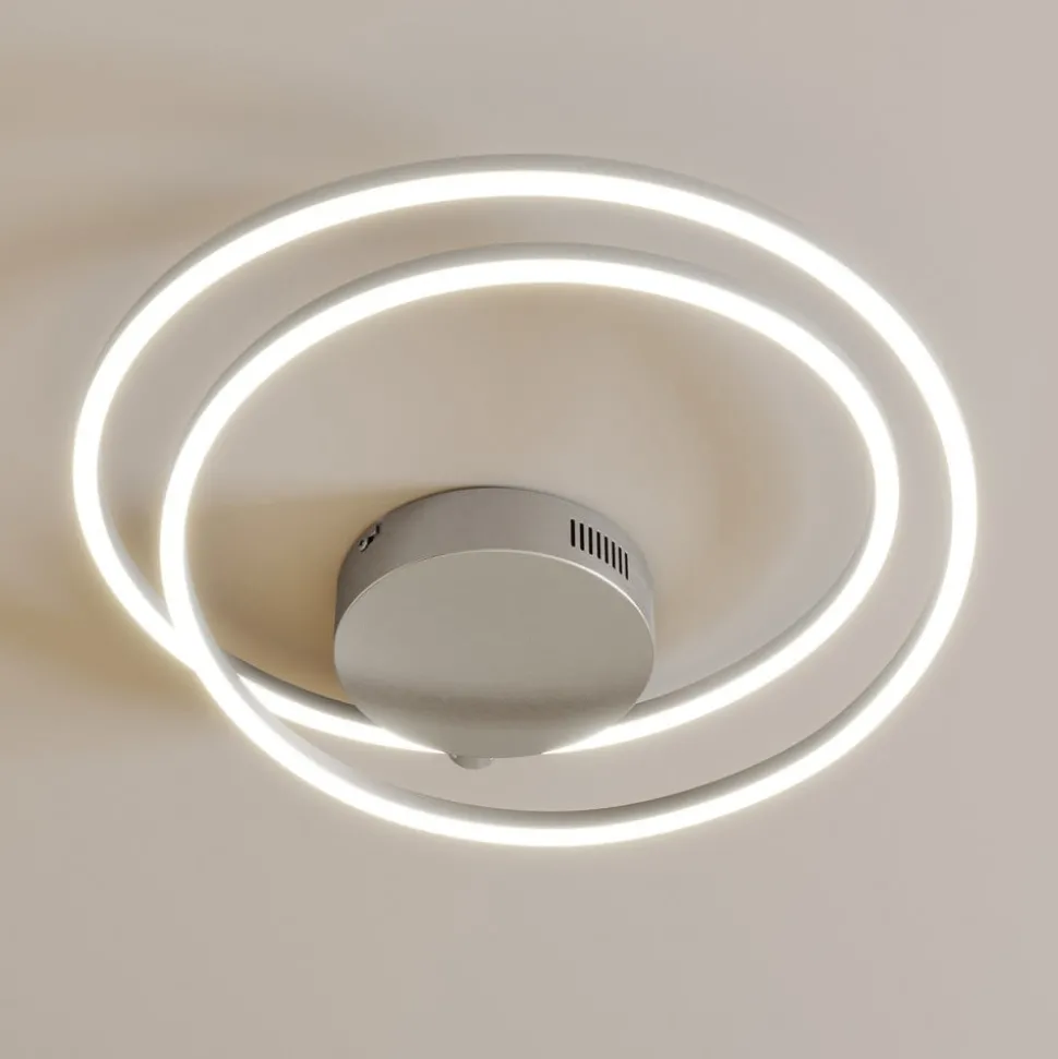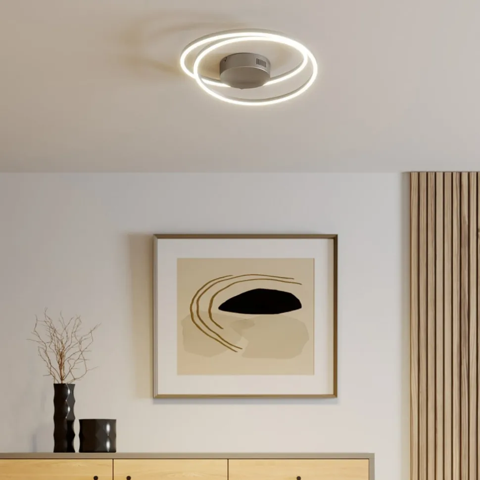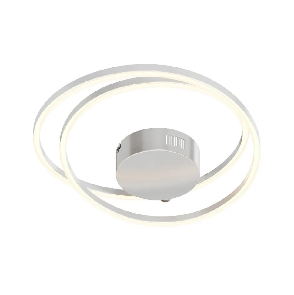 Davian ronde LED plafondlamp met satijnnikkel afwerking, dimbaar via de wandschakelaar Davian maakt indruk met haar delicate ontwerp en past zeer goed in moderne interieurs. Als LED plafondlamp kan ze worden gebruikt in allerlei soorten woonruimtes zoals keukens, gangen en slaapkamers. De filigraan ringen zijn eigenlijk een spiraal en het metalen oppervlak is van gesatineerd nikkel, wat heel goed past bij de toch al zeer moderne look. De LED’s passen als een lint om het delicate metalen lichaam en ze hebben een goede helderheid zodat de kamer optimaal verlicht kan worden. Als de helderheid moet worden verminderd, kun je de normale wandschakelaar gebruiken en de helderheid in drie stappen aanpassen.