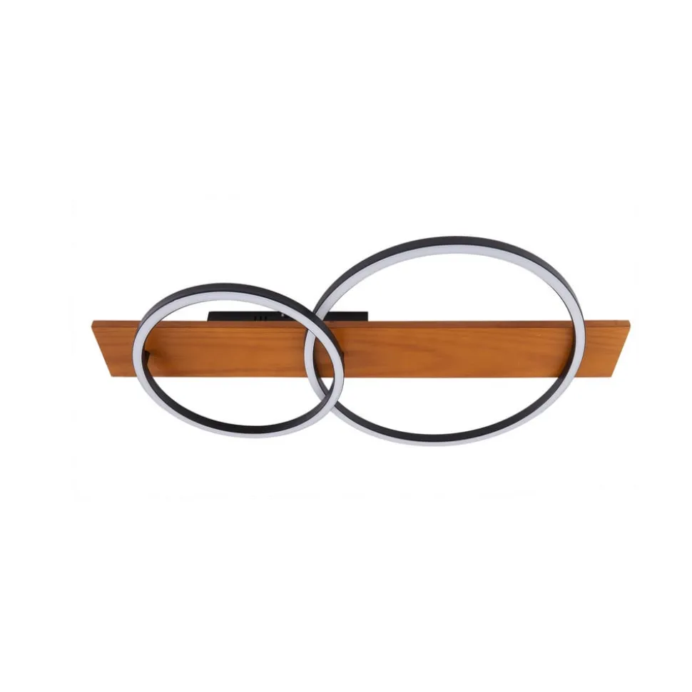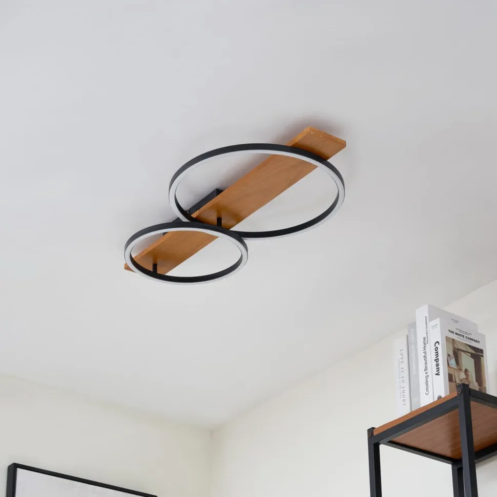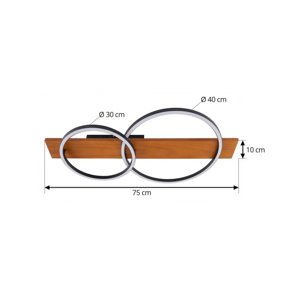 LED plafondlamp Galad met twee lichtkringen en praktische dimfunctie De LED plafondlamp Galad combineert in haar ontwerp de helderheid van wit en zwart met de natuurlijkheid van hout. Dit 2-lamps armatuur is meer dan alleen een lichtbron; het is een modern designelement voor elke kamer. Of het nu in de eetkamer, woonkamer, keuken of hal is, Bolgar creëert een sfeer die zowel uitnodigend als stijlvol is. Een wandschakelaar maakt het mogelijk om het licht gewoon aan en uit te doen. Dankzij de 3-staps dimtechnologie met geïntegreerde uit-functie kan de lamp ook tot drie verschillende helderheidsniveaus worden gedimd door meerdere keren op de schakelaar te drukken: 100%, 40% en 10%.